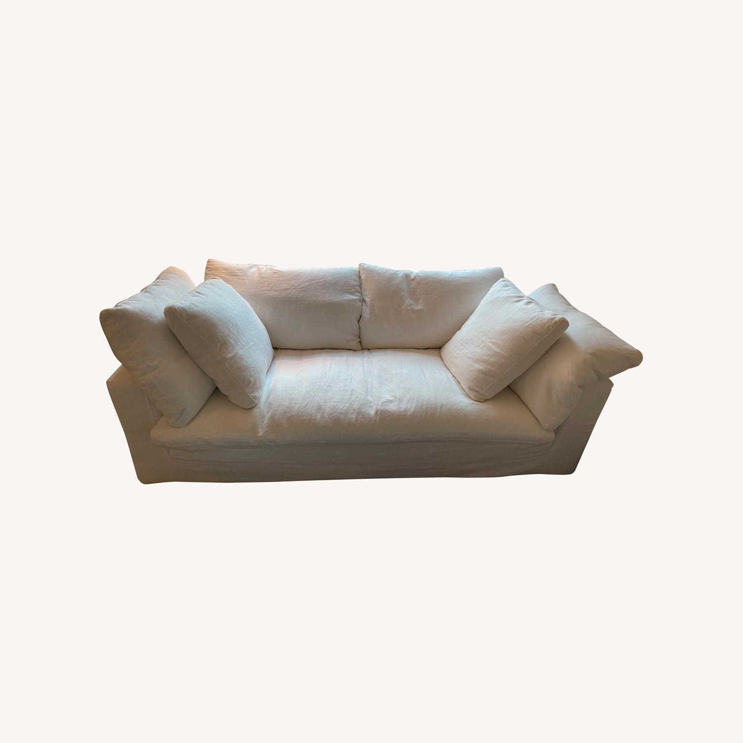 Seller's Notes:Gently used, authentic RH cloud couch in a classic white Perennials Performance Textured Linen Weave (providing stain resistance and easy cleaning). Classic depth, 6ft long, with feather wrapped core fill. Includes 2 side pillows and 2 accent pillows in addition to one king seat cushion and 2 back cushions.