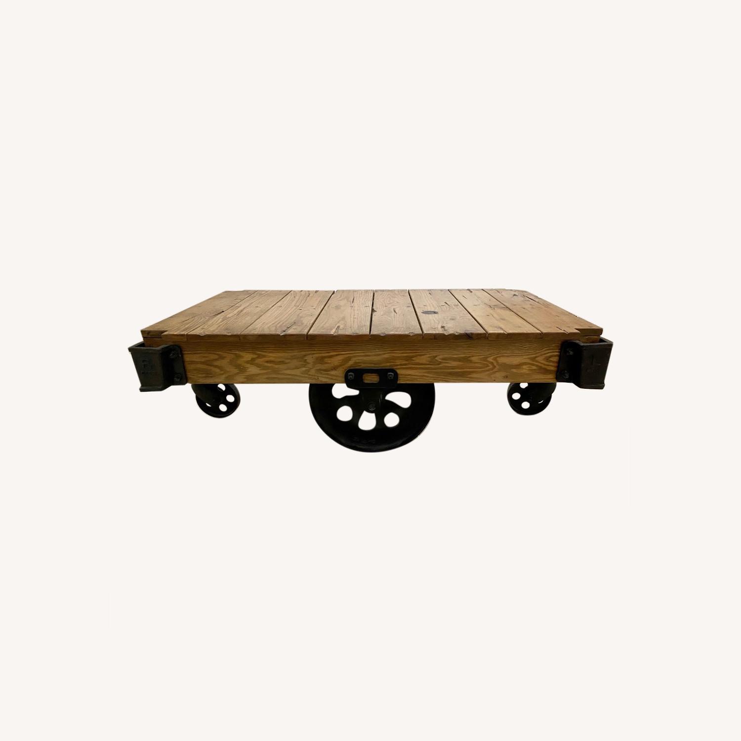 Seller's Notes:**Table has 1 circular burn mark from a candle on the top, can likely be sanded out. *otherwise in great condition Made of solid hardwoods, such as oak, maple or hickory Tops have been cleaned and oiled but still bear the marks of their history and may have nicks and imperfections Original cast iron wheels, bolts and plates End wheels rotate to keep cart stationary Each cart is a vintage original, with variations in distressing, cracks, finish and wheel construction Size is approximate This item is artisan crafted with meticulous care. Given its handmade and hand-finished nature, variations in the wood or metal work are to be expected and celebrated. Each item is unique and no two are exactly alike. Quantities are limited. This item is crafted with unsealed metal that may rust over time, enhancing its rustic one-of-a-kind character. Note that the rust may rub off if it comes in contact with other furniture or fabrics.