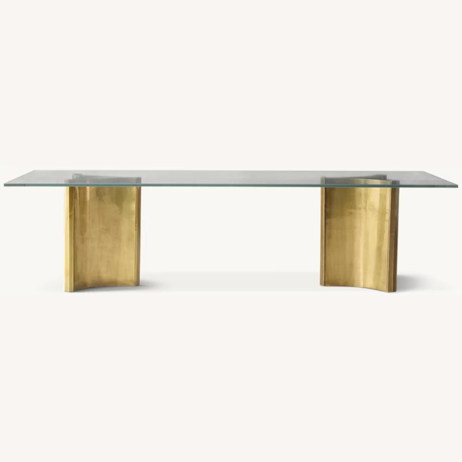 Seller's Notes:Dalton table is a sculptural statement piece. Inspired by 1970s postmodern design, its curved Y-form metal pedestals are showcased beneath a clear glass tabletop.