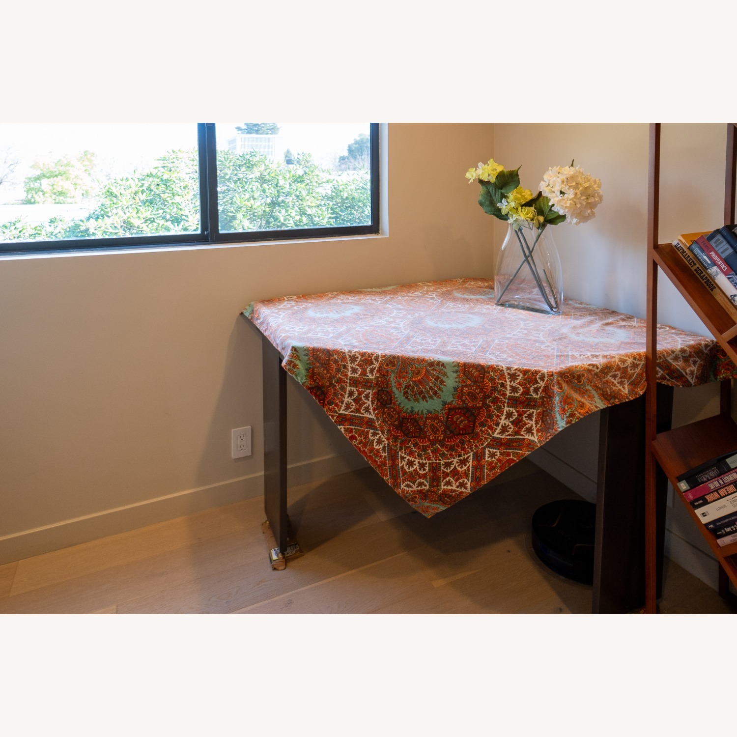 Seller's Notes:This is a unique shaped table, made to fit into a corner. It is dark brown/bronze metal in color with a flat top and three flat wide metal legs. It is very spacious, and was used to hide some items under the table by draping it with a tablecloth. It was purchased at Restoration Hardware outlet store. There are a few scratches on the metal top and legs. The table top dimensions are 45, 47 (diagonal), and 24 inches. The height is 30 inches with screw feet for leveling.