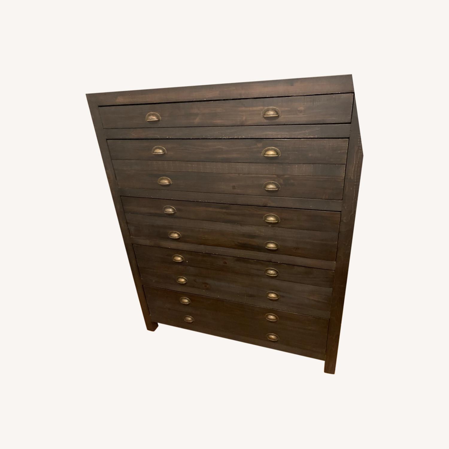 Seller's Notes:Dark brown solid wood Restoration Hardware dresser with 5 drawer storage. The very top drawer is designed to hold small items such as jewelry and important documents. The depth of the drawers allow for a fair amount of storage.