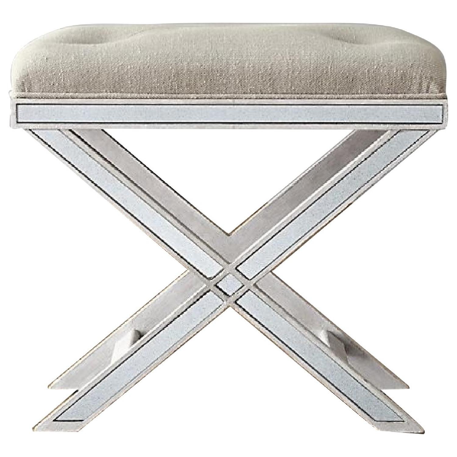 Seller's Notes:Restoration Hardware Delaney Mirrored Stool in Vintage Grey Belgian Linen DIMENSIONS 20"W x 14"D x 18"H Weight: 11 lbs. Kiln-dried hardwood frame is covered in tempered glass panels with a silver mirror églomisé finish Wood trim is finished in vintage grey Vintage grey finish is heavily distressed and worn along the edges using a 15-step process to replicate the authentic look of age Back is fully finished, allowing versatility in room placement Tufted seat is upholstered in dove Belgian linen Wipe with a soft, dry cloth. Avoid direct sunlight and heat to protect the finish.