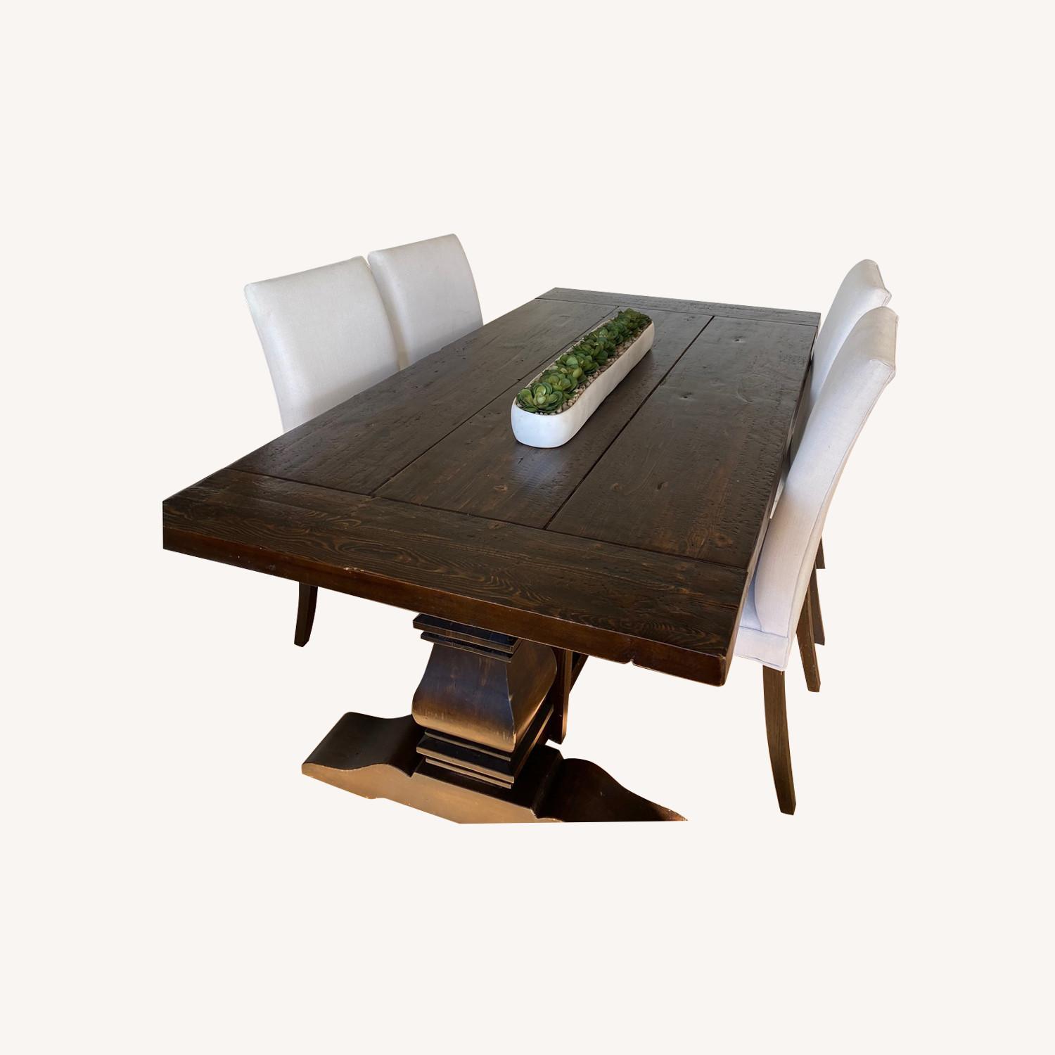 Seller's Notes:Love this dining table! Only bought 4 years ago with plans to keep forever but then moved and it’s too large for our new space. It’s the most beautiful wood that even with wear looks just as nice as the day we first bought it because the look is rustic. Incredible quality! I have 6 white restoration dining chairs (as pictured) I’m willing to throw in for free with purchase because they are worn in but are perfect chairs and so comfy just need a good clean or new fabric! PRICED TO SELL!