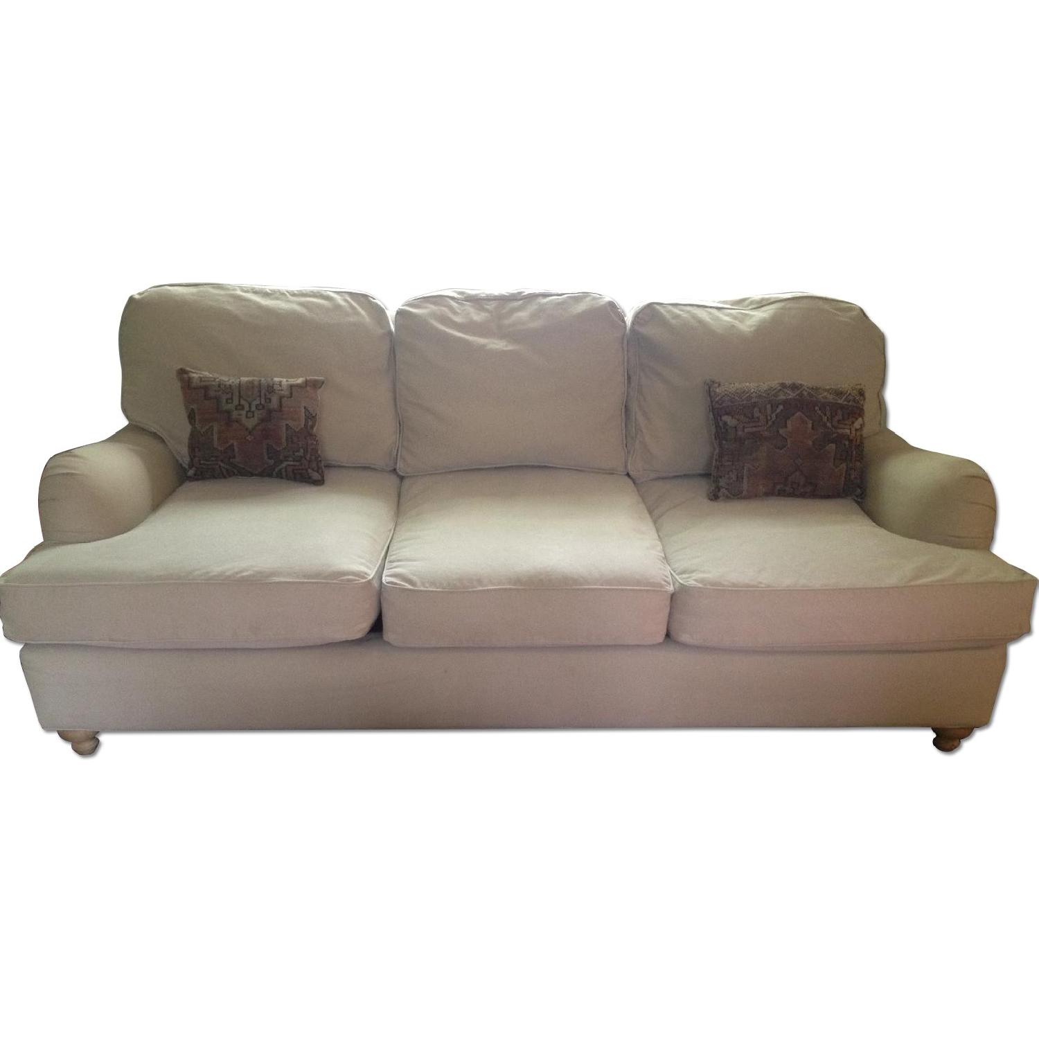 Seller's Notes:I love this less than two-year old sofa but we're redecorating our house and it doesn't fit in the room we need to move it. It retails new for $2875. My loss is truly your gain! It's Restoration Hardware's 84" English Roll Arm Sofa. It has a the 45" luxe depth so it's super comfy and it's upholstered in a soft army duck fabric in the flax color. The pullout HAS NEVER BEEN USED and is still wrapped in the original plastic! Aside from a tiny and hardly noticeable paint drip on the arm and on the underside of the middle bottom cushion (see photos), it's in fantastic shape. It comes from a smoke-free home but one with a cat. Details: 84"W x 45"D x 35"H Kiln-dried hardwood 8-way, hand-tied spring suspension Mortise-and-tenon joinery Deep, sink-in comfort 3 seat cushions/3 back cushions Standard fill (polyfiber wrapped around 4½" foam core) with coordinating polyfiber back cushions Hardwood legs