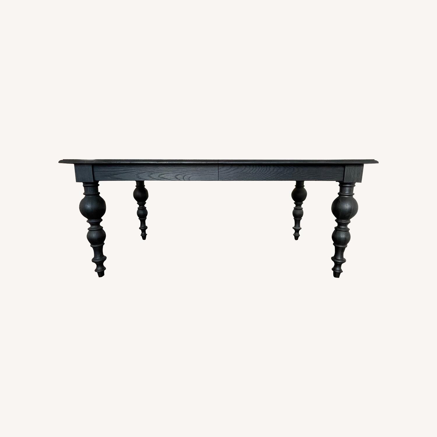 Seller's Notes:Restoration Hardware extending dining table in dark oak (black). Seats four without extension and six with leaf in place. In good condition with minor, age-appropriate blemishes. Sleek, modern design and classic style, it will complement any decor and add a touch of elegance to any home.