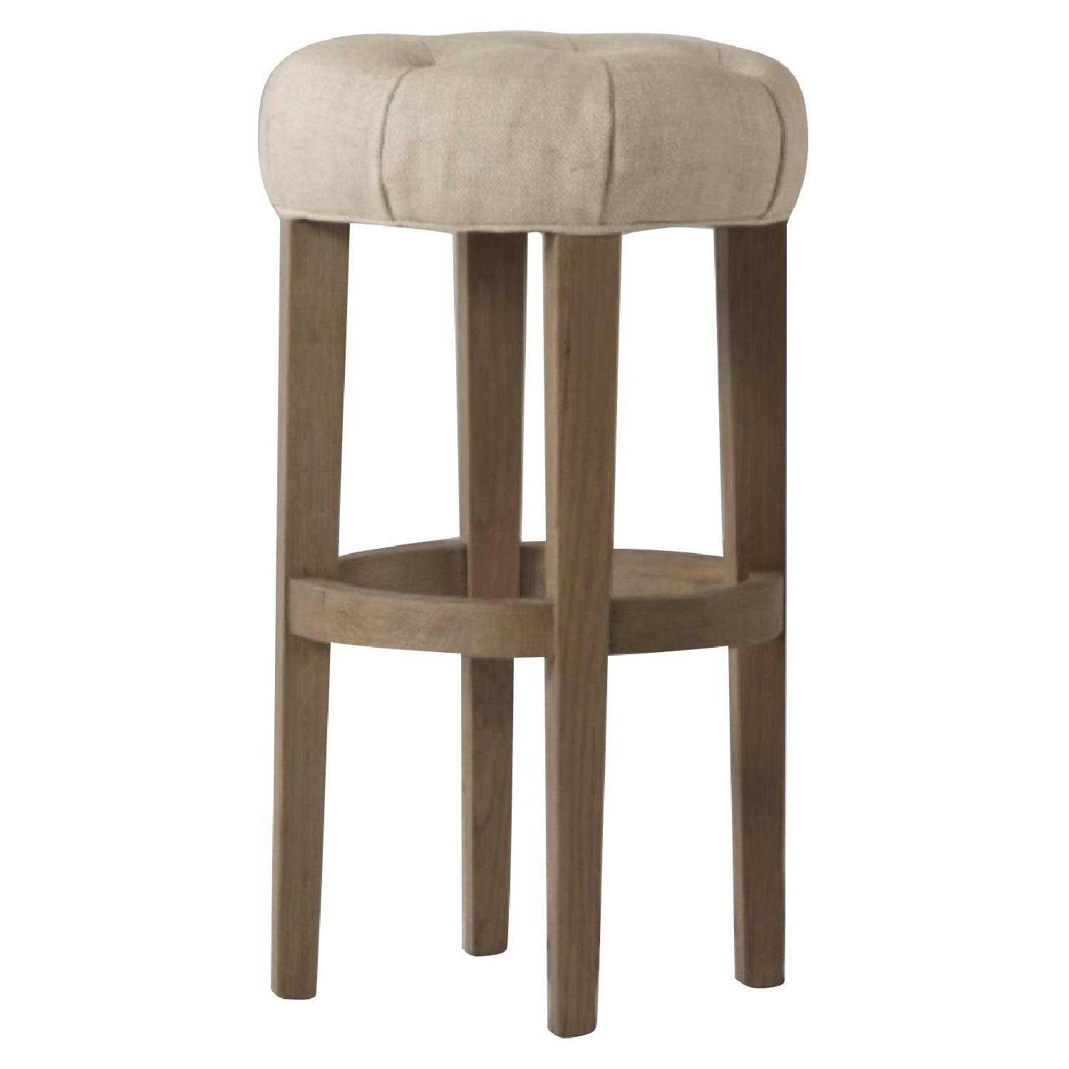 Seller's Notes:Restoration Hardware Bennett backless fabric counter stools. Made of oak with a weathered finish and an upholstered seat with button tufting. Fabric is belgian linen in "sand," a light natural color. Four available, all like new.
