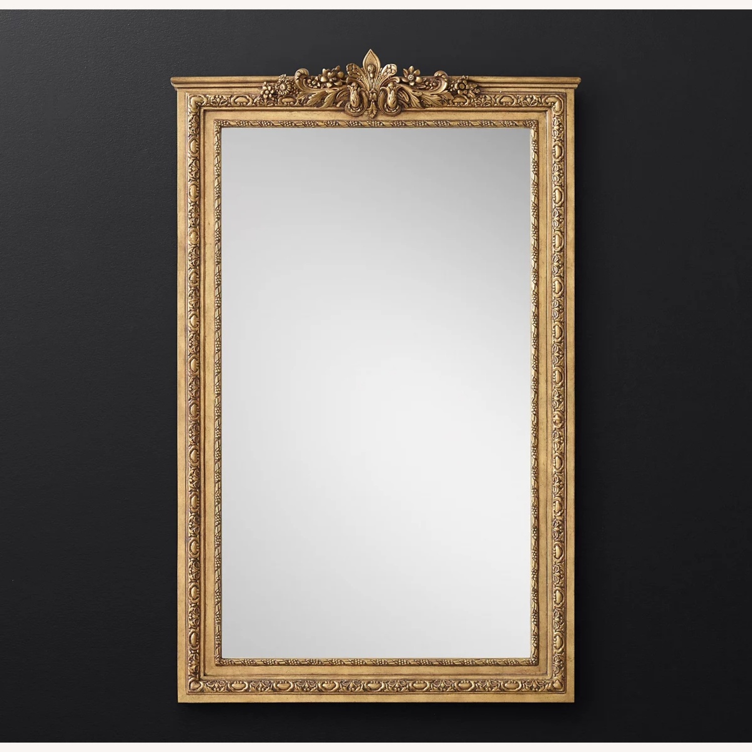 Seller's Notes:Crowned with a signature fleur-de-lys and foliate cresting, our mirror's ornate carved frame and metal-leaf finish replicate the grandeur of French Second Empire design.