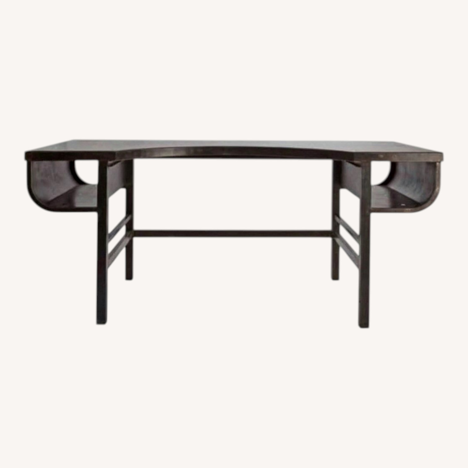 Exhibiting the minimalist aesthetic and durability of an industrial age workhorse, our metal desk also offers remarkable agility. The amply sized desktop, complemented by two curving, open compartments for storage, also features a hidden slide-out panel beneath the curved top to expand the workspace or support a keyboard.