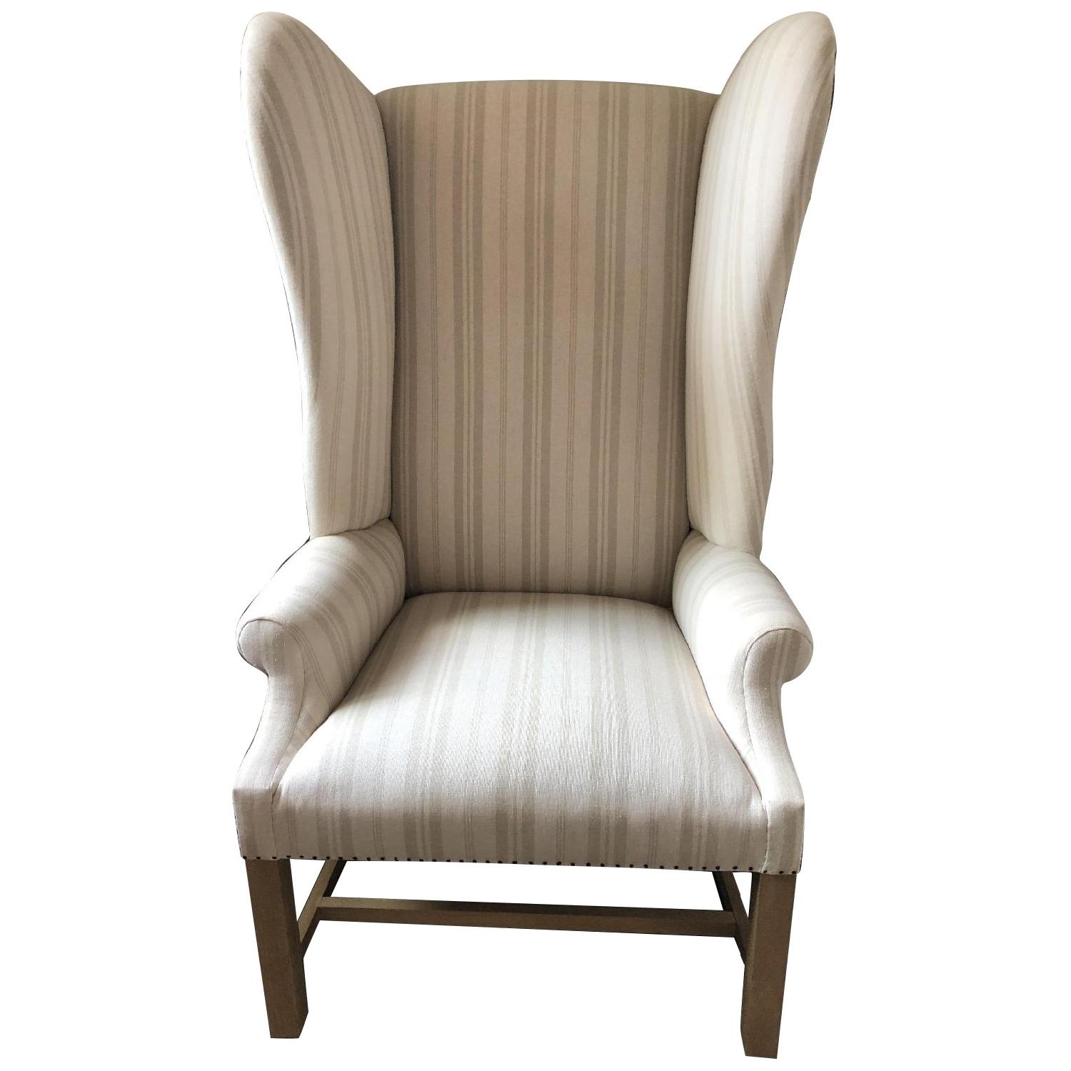 Wear and tear details: Restoration hardware chair. Refabric with natural stripe linen and soft brown velvet back