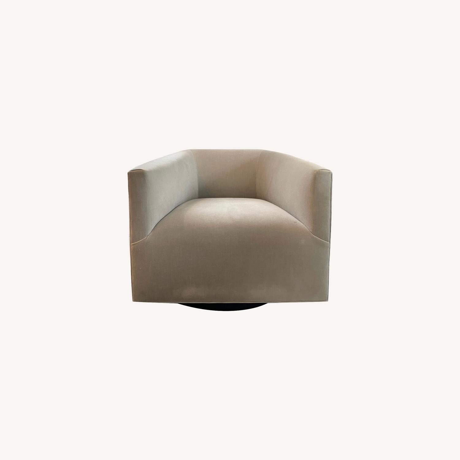 Seller's Notes:Restoration Hardware 1950s Italian shelter arm swivel chair with oak base, in a dove gray velvet. Bought in 2018.