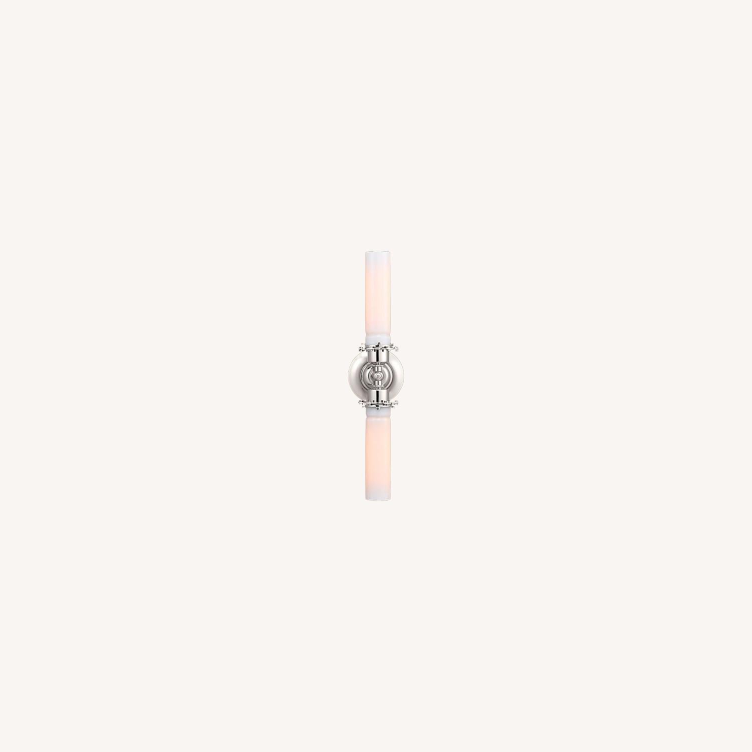 Seller's Notes:Fitted with a valve and a striker and a shade to protect the flame, turn-of-the-century gas lamps were the forerunners of both 20th-century electrification and contemporary industrial design.Our replica features a white glass shade that has the look of vintage milk glass. Overall: 21¼"W x 4¾"D x 5"H Backplate: 4¾ diam. Weight: 9 lbs.