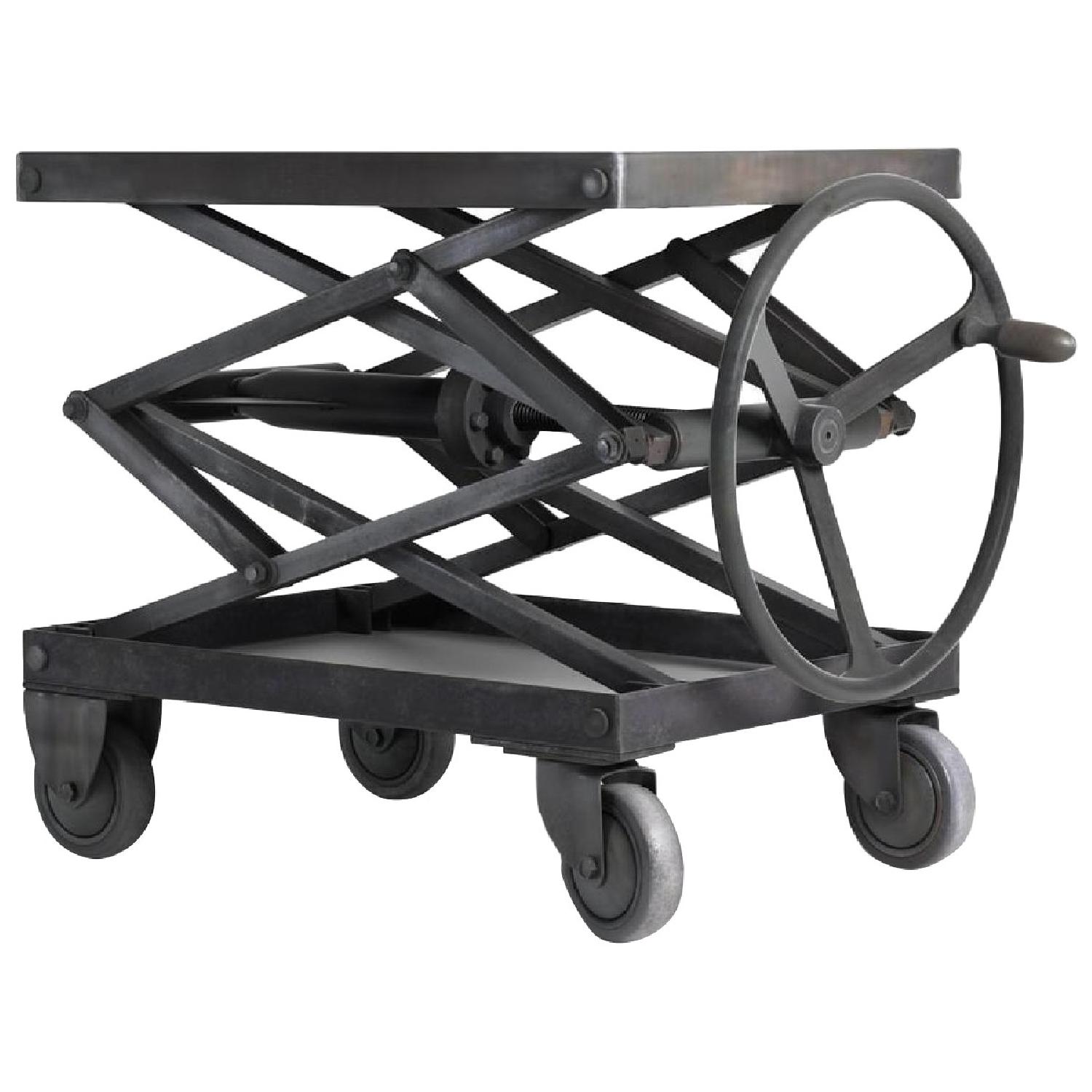 Seller's Notes:Like new (never used) iron Restoration Hardware coffee table. With an early 20th-century American factory jack as a bold, industrial table with uncommon functionality. Crafted of heavy sheet metal, it's set on casters and powered by a big wheel to lift or lower. Dimensions are 31½"W x 19½"D x 31"-42¼"H
