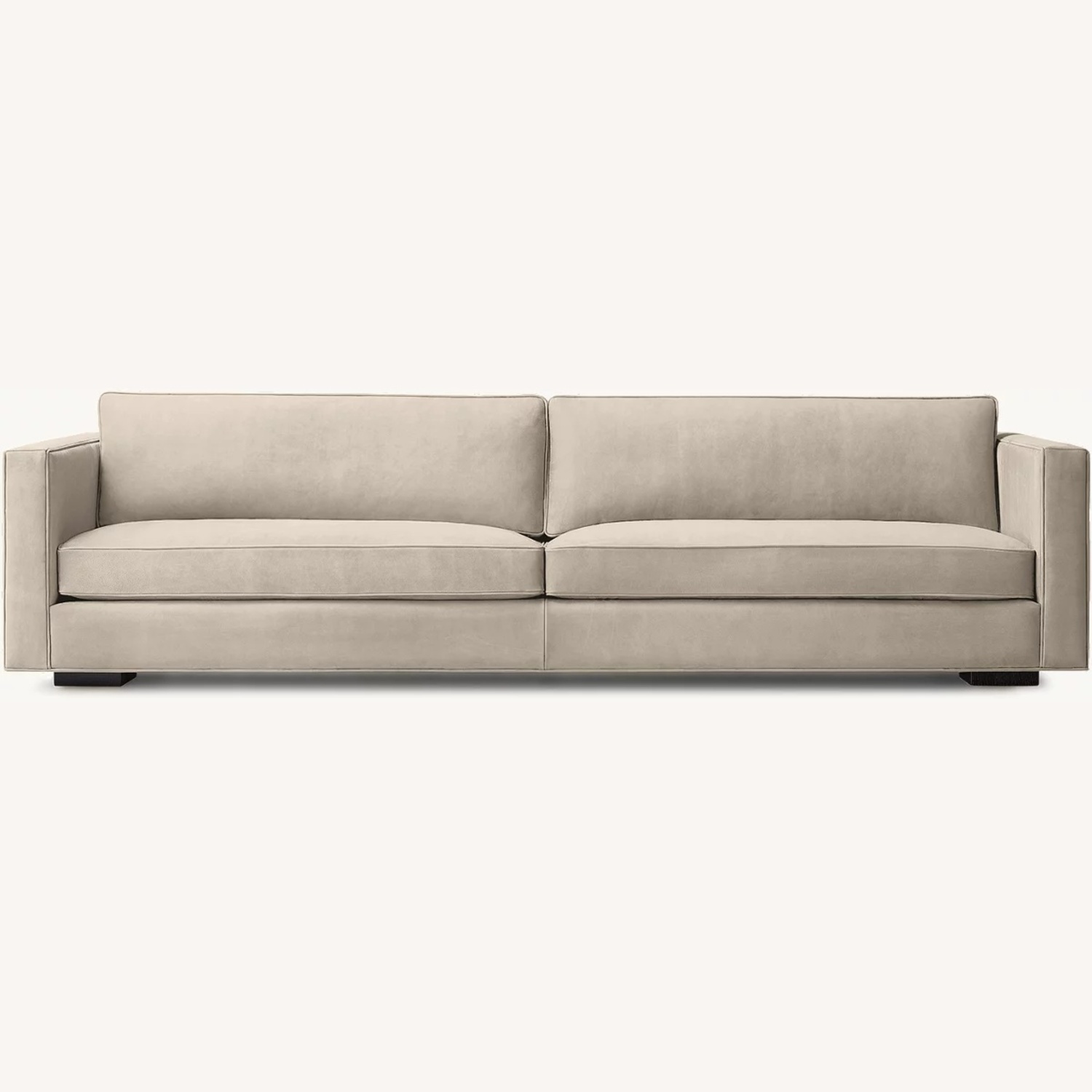 Seller's Notes:Restoration Hardware Italia White Leather Sofa – 9 ft RH Italia leather sofa in white, clean modern look with low track arms and a bench seat. • 108” L x 41” D x 28” H • Premium leather (American Leather) • Down-filled cushions • Metal legs Good condition. Light, normal wear. No rips or structural issues. Originally ~$15K+.