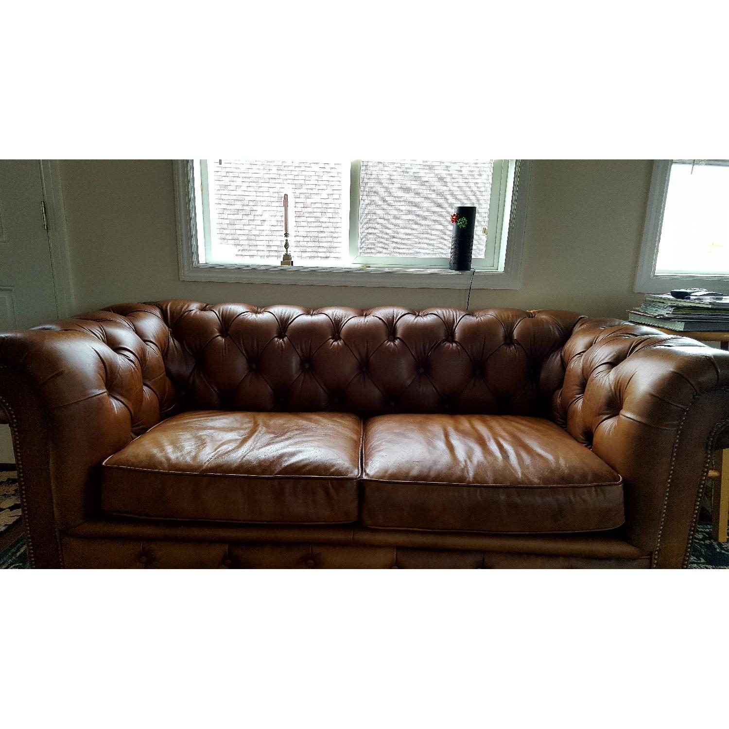 Seller's Notes:This sofa is perfect for smaller spaces! The sofa was gifted to us prior to the summer, and although we have enjoyed it, we were looking for a more accommodating sofa. This sofa has been well maintained, although its first home had a cat, and the second home has a dog [he wasn't on it much as he isn't much of a leather lover!]. it was vacuumed clean when we received it due to the cat hairs and current allergy suffers - no adverse affect noted. This particular length is no longer produced by restoration hardware, but as you can see the couch is in good condition with moderate signs of wear. The couch is on wheels, there is studding around the frame which is all intact. It is a nice piece that has been well cared for. Both homes have been non-smoking! Color is vintage cigar