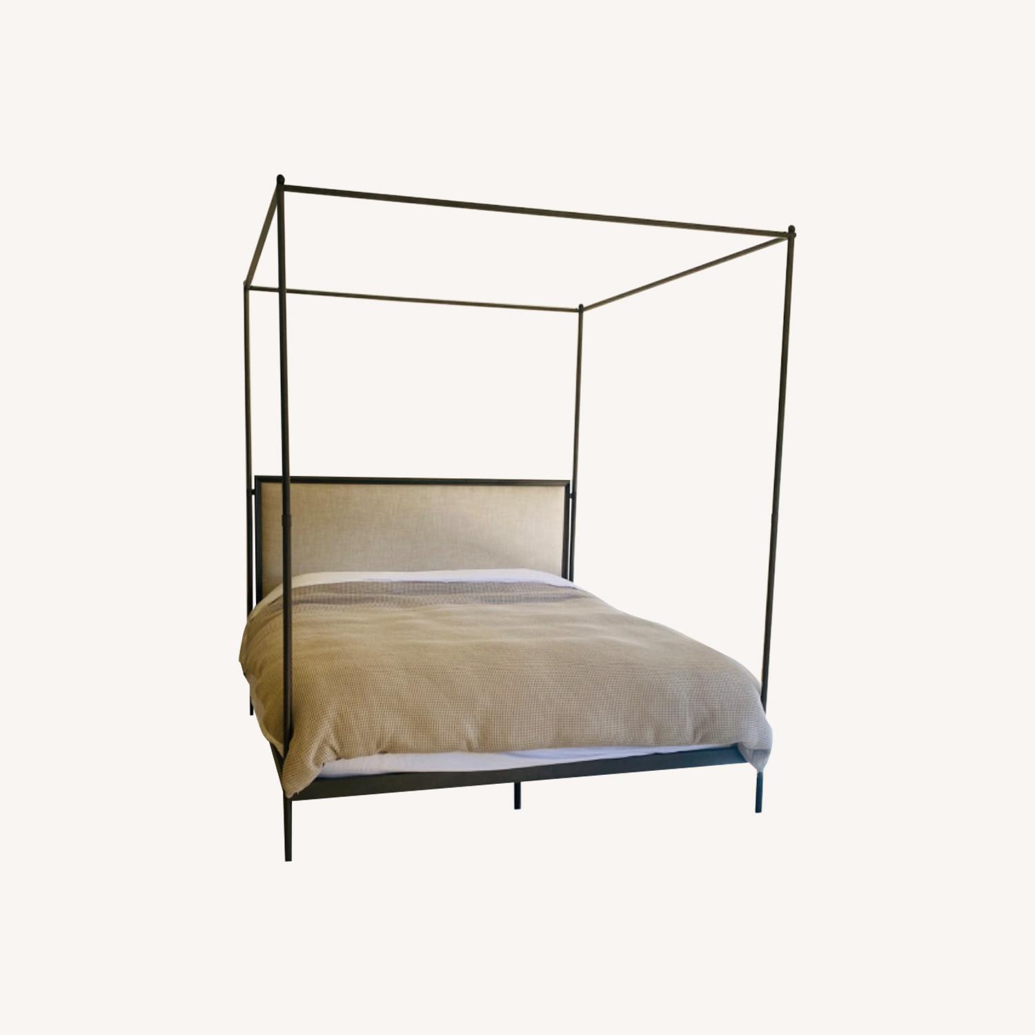 Seller's Notes:Brand new “Restoration Hardware” RH canopy bed, available in original packing. Custom designed in India; Identical to RH. You won’t be able to tell the difference. Check 19th century French contemporary iron bed Please note: bed is semi pre-assembled (posters are attached to the headboard and footboard). Fits through a standard door (80" high). Dimensions after assembly: Length 83" Width 79.25" Height 95" Retail price $5K including taxes and shipping. Our price 1500 (70% off) Frame: material iron Frame color: black Headboard: velvet fabric in sand color