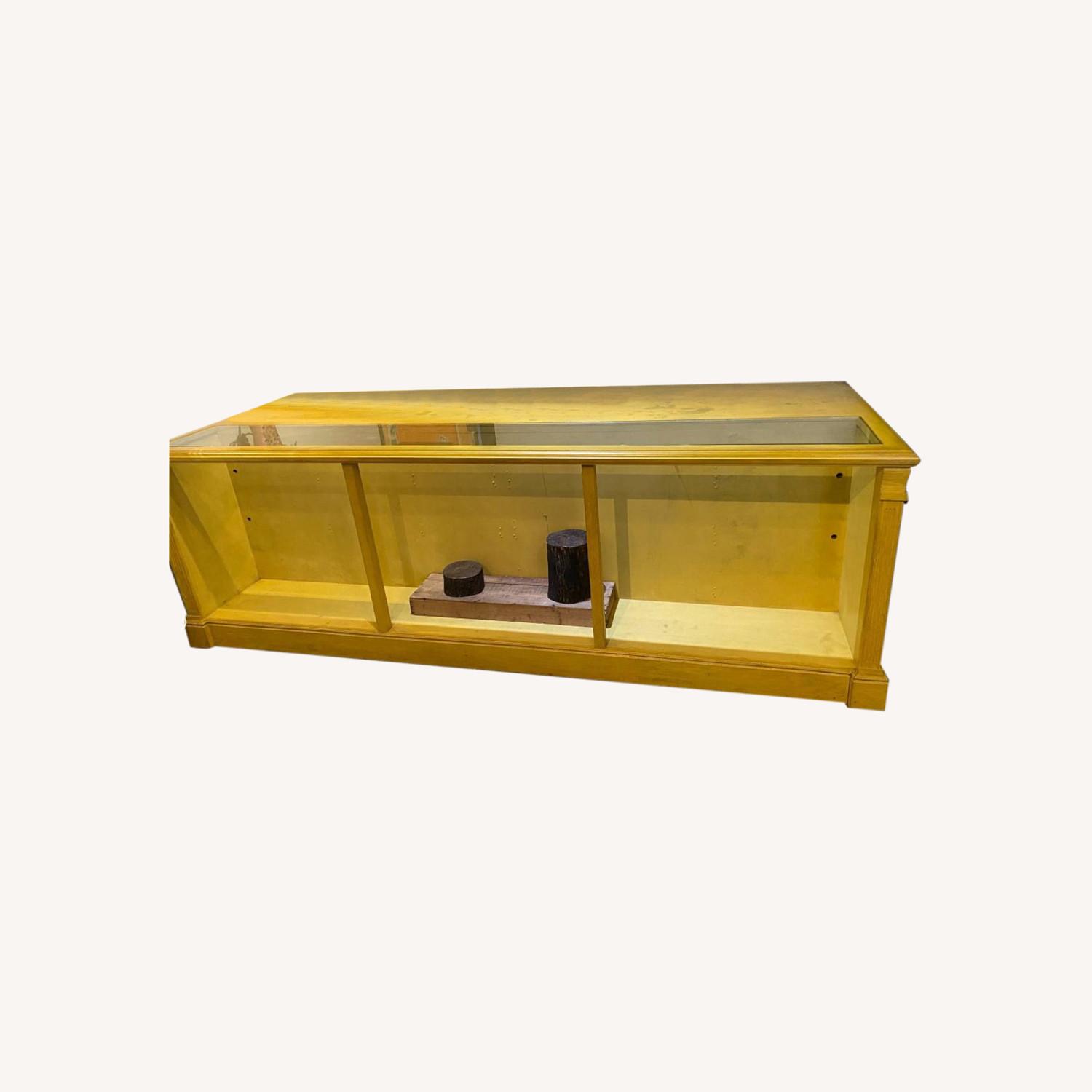 Seller's Notes:This large counter from Restoration Hardware is an amazing find and could be used in a retail store, cafe or workshop. It’s solid wood construction is very strong and well made. We refinished it with golden milk paint but it could easily be sanded and painted another color. The back side has lots of storage space, drawers, files and cubbies. The front had shelving which we removed but could be replaced or turned into a locking glass case.
