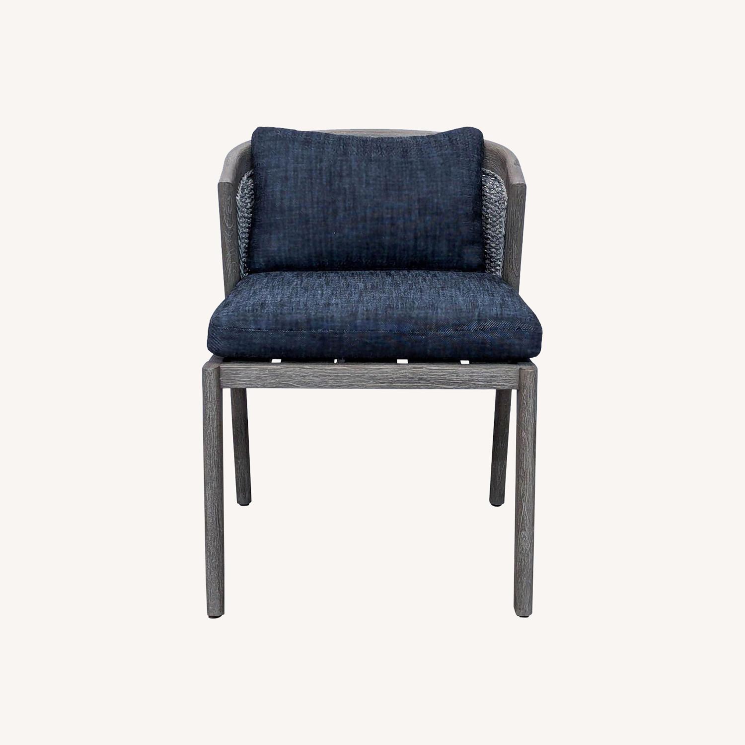 Seller's Notes:The Malta outdoor chair features an open and architectural mid century style weathered teak frame with a handwoven all-weather wicker back and upholstered quick dry cushions.. Brand: Restoration Hardware. Model: Malta. Material: wood,fabric. Seat heigt: 21. Retail price: $1590. Gently used - any blemishes or damage will be included in the photos. #SKU: 1063518. Tags: transitional,teak,modern,mid century modern,fabric