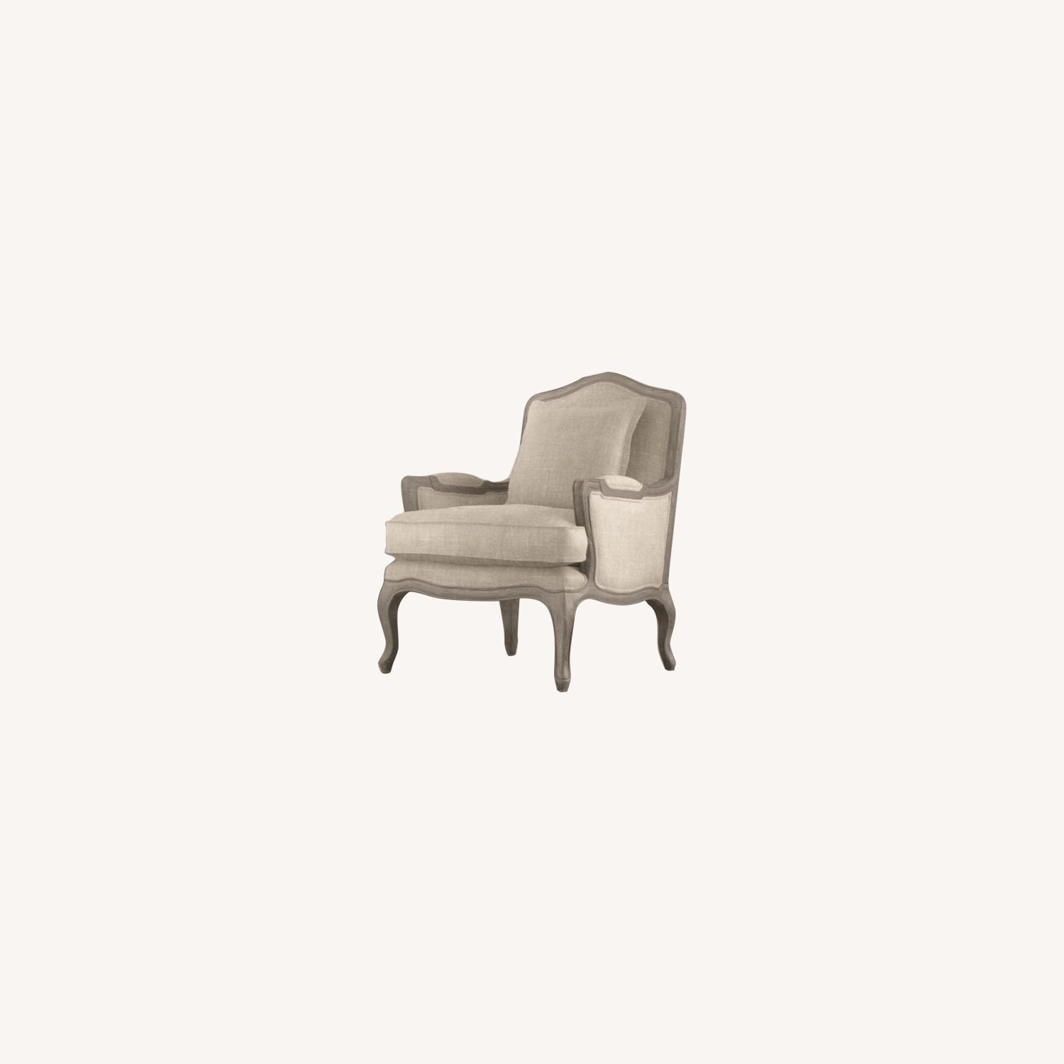 Seller's Notes:Traditional Rococo carvings and ornamentation have been stripped away to showcase the chair's exquisite curved lines Built by hand with mortise-and-tenon joinery Plushly padded for comfort, it has the classic bergère's low, deep seat and tipped back Seat cushion is down, feather and polyfiber wrapped around a foam core Solid oak legs Grey Oak color with Sand color Belgian Linen