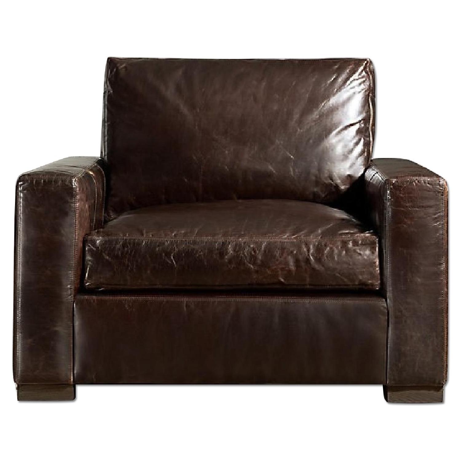 Seller's Notes:Purchased this Restoration Hardware sofa (and a chair, which is in another listing) just before a new job and has been in AC storage since. About 3-months use. Basically brand new condition. Down-feather fill. Color is Glove (espresso). Chair is 48" wide, 33.5" height, 40" deep. Super comfy and it actually can sit 2 people cozy. Still wrapped in storage. See Restoration Hardware site for details.