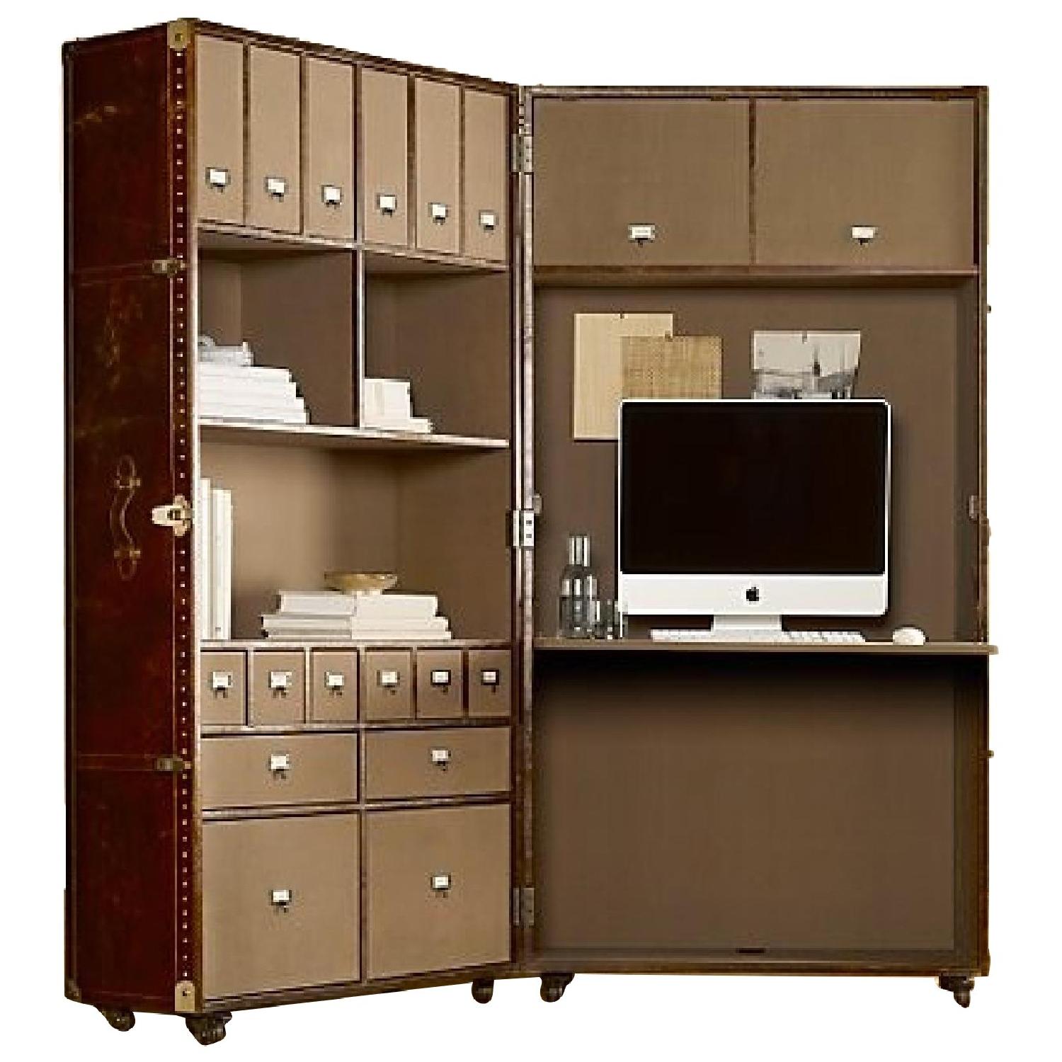 Seller's Notes:I’ve temporarily lowered the price to $1095 if you’re able to pick up or accept delivery by Monday, June 4th. DETAILS - One handle of the interior drawers broke, but can easily be replaced. Handmade of distressed Vintage Cigar leather over a solid wood frame Aniline-dyed leather has an antiqued, vintage look Accented with over 3,000 hand-hammered brass nailheads Leather-bound corner brackets, leather-wrapped handles, oak slats with a tobacco finish and cast-metal antiqued hardware Lined in leather-edged canvas Features a pull-down desktop and multiple drawers, cubbies, wire management and bookshelves Stands on wheels for mobility and closes for storage and privacy No two are exactly alike, making each trunk truly unique Anti-tip kit hardware and installation instructions included. We encourage installation of the tip restraint, which securely anchors the product to the wall. Items not properly anchored pose a potential safety risk. Wipe with a soft, dry cloth DIMENSIONS - Closed: 38"W x 29"D x 76"H Opened flat: 76"W x 14½"D x 76"H Opened to 90°: 52½"W x 52½"D x 76"H Desktop: 36"W x 30¼"D x 30"H Weight: 378.4 lbs.