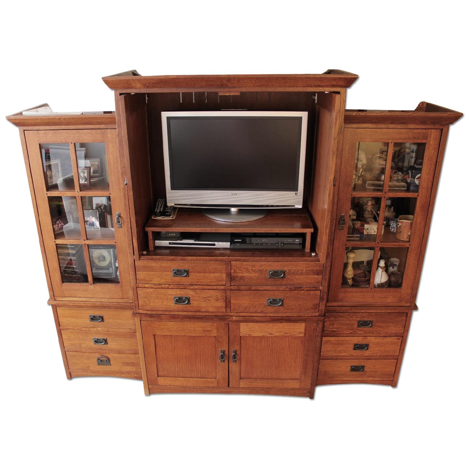 Seller's Notes:Restoration Hardware Mission Style Armoire with matching casements Material: Oak Color: Medium Wood Tone This Restoration Hardware Mission style Armoire / Entertainment Center and matching side cabinets set is in pristine condition. The model has been discontinued and is now very difficult to find, as those who appreciate quality furniture will know. The armoire measures approximately 77" high, 47" wide and 24" deep. The top cabinet and drawers sit on top of the base cabinet. The top and base cabinet can be moved in two pieces. You can use the armoire for storage, clothes, or as an entertainment center. The top cabinet doors open and slide all the way in so you can watch TV, and the back of the cabinet is vented for electronics. The bottom cabinet has one shelf inside. The matching casements measure approximately 70" high, 23" wide and 18" deep. The top cabinets sit on top of the base drawers. These can be moved in two pieces. The top cabinets have six glass-paneled fronts and three spacious shelves. The bases consist of three drawers each. Construction is of oak, not veneered particleboard. Drawer boxes are solid wood. Drawer joints are English dovetailed front and back. Drawers are finished with a dark bronze classic mission pull handle. This piece will make a stunning addition to any home for many years to come.