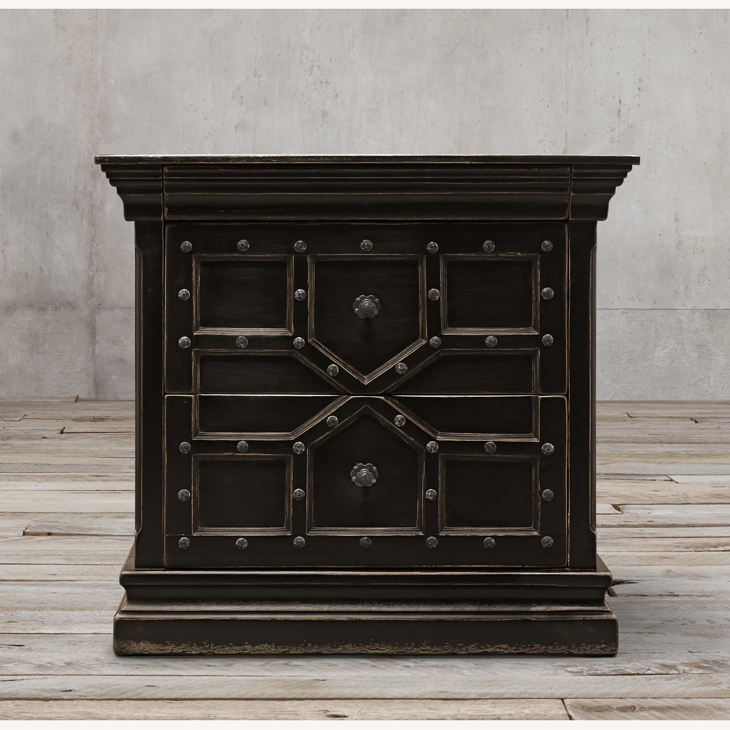 Seller's Notes:17th C. Castelló Closed Nightstand Restoration Hardware set of 2 pc. Inspired by late 17th-century Hispano-Moresque designs from Spain's Andalusia region. Artisan crafted from solid walnut with mortise-and-tenon joinery. A multistep finishing process gives the wood a gently aged patina. Topped with molded cornices. Wrought-iron drawer pulls have a textured surface. Set on plinth-style bases. Wipe with a soft, dry cloth