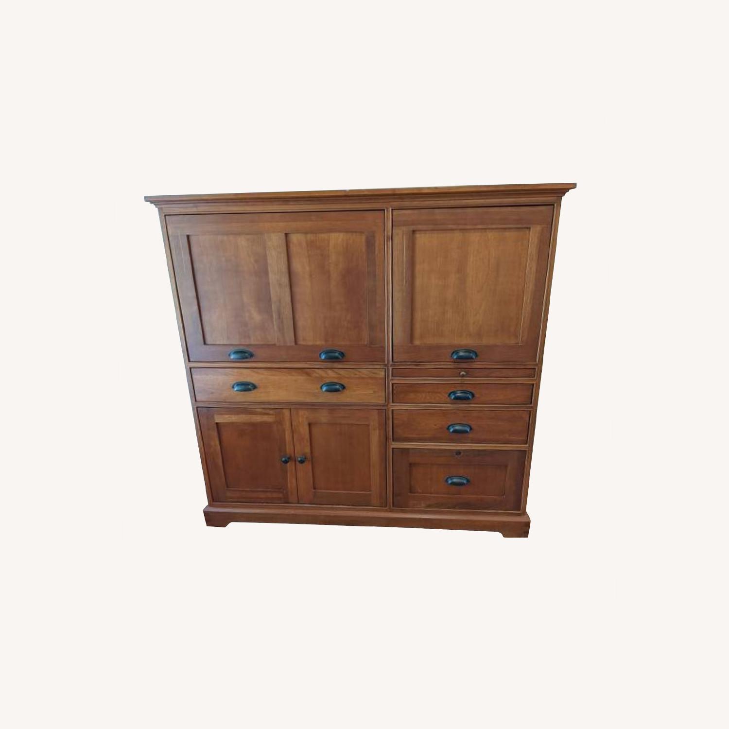 Seller's Notes:We have a beautiful cherry wood office armoire/workstation for sale, originally from Restoration Hardwood. This is a very solid piece and great as an all-in-one office set up. It has space for a large monitor, a pull-out keyboard tray and two pull-out writing desks/surfaces, open shelving, a pull-out printer area, a locking file cabinet and two large drawers. It's perfect for working at home when you don't have a separate office area. We have loved this piece, but we are moving and can't take it with us. This piece in good condition, but does have scratches and nicks. Overall though, it still looks and operates great and doesn't have any warping, sagging or fading. Please note this is very, very heavy. I recommend using a service like Lugg, with 2-3 people and 1 or 2 dollies to move this without damaging floors.