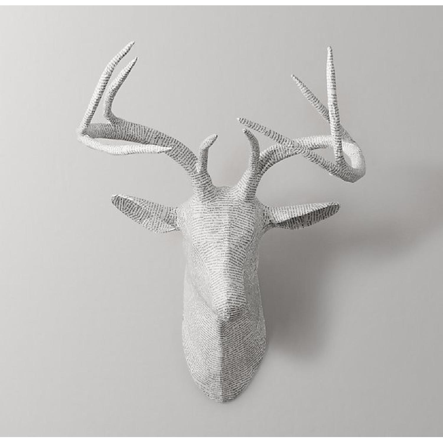 Seller's Notes:Recycled materials transform a lodge classic into an eco-friendly sculpture for the walls. Celebrating the majesty of an antlered stag, our papier-mâché bust is handcrafted by artisans in Haiti using only recycled paper, recycled steel wire and arrowroot starch glue. • Base form is cast from a mold made from an original clay sculpture • Multistep papier- mâché process includes building and refining the form by hand • Antlers are created using recycled steel wire wrapped with recycled paper • Finished with a layer of white paper printed in French • This item is handcrafted with meticulous care. Given its hand-finished nature and the natural variations in recycled materials, each item is unique and no two will be exactly alike.