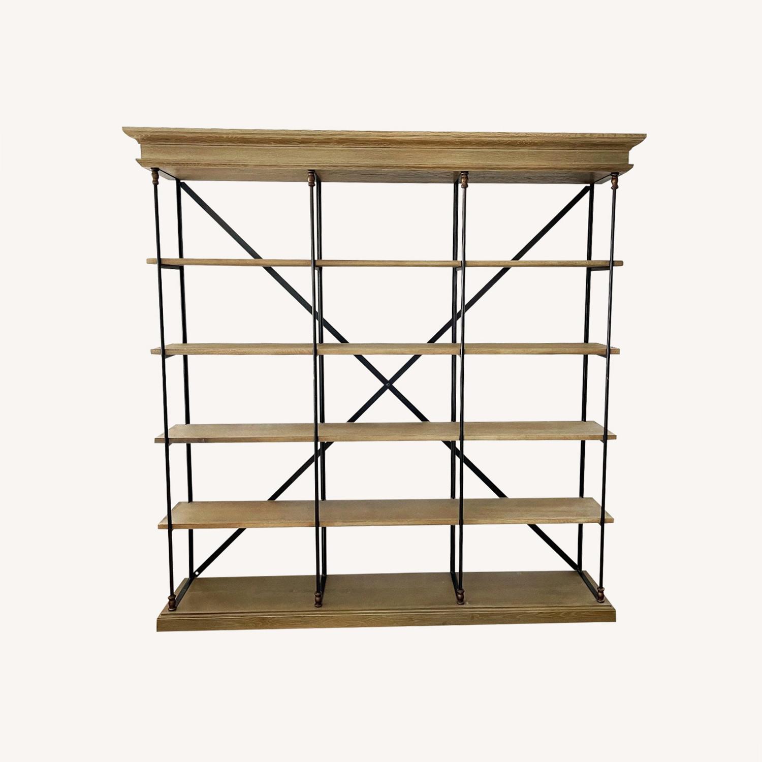 Seller's Notes:Extremely Rare, Discontinued Collectors RH Item. The late-20th-century postmodern movement embraced centuries of design, combining pared-down modernism with classical detail. Both are reflected in our tower, an exacting reproduction of the French original. Structural iron frame has an X-shaped back support and decorative castings at top and base Cornice top, shelves and base built of oak 4 fixed shelves, plus base Given its handmade and hand-finished nature, variations in the wood or metal work are to be expected and celebrated. Each item is unique and no two are exactly alike. 83½"W x 84"H Shelf Overall: 83½"W x 15"D x 84"H Distance Between Fixed Shelves: 14¼" Shelf: 80½"W x 11½"D x 1"H 83½"W x 97"H Shelf Overall: 83½"W x 15"D x 97"H Distance Between Fixed Shelves: 17" Shelf: 80½"W x 11½"D x 1"H