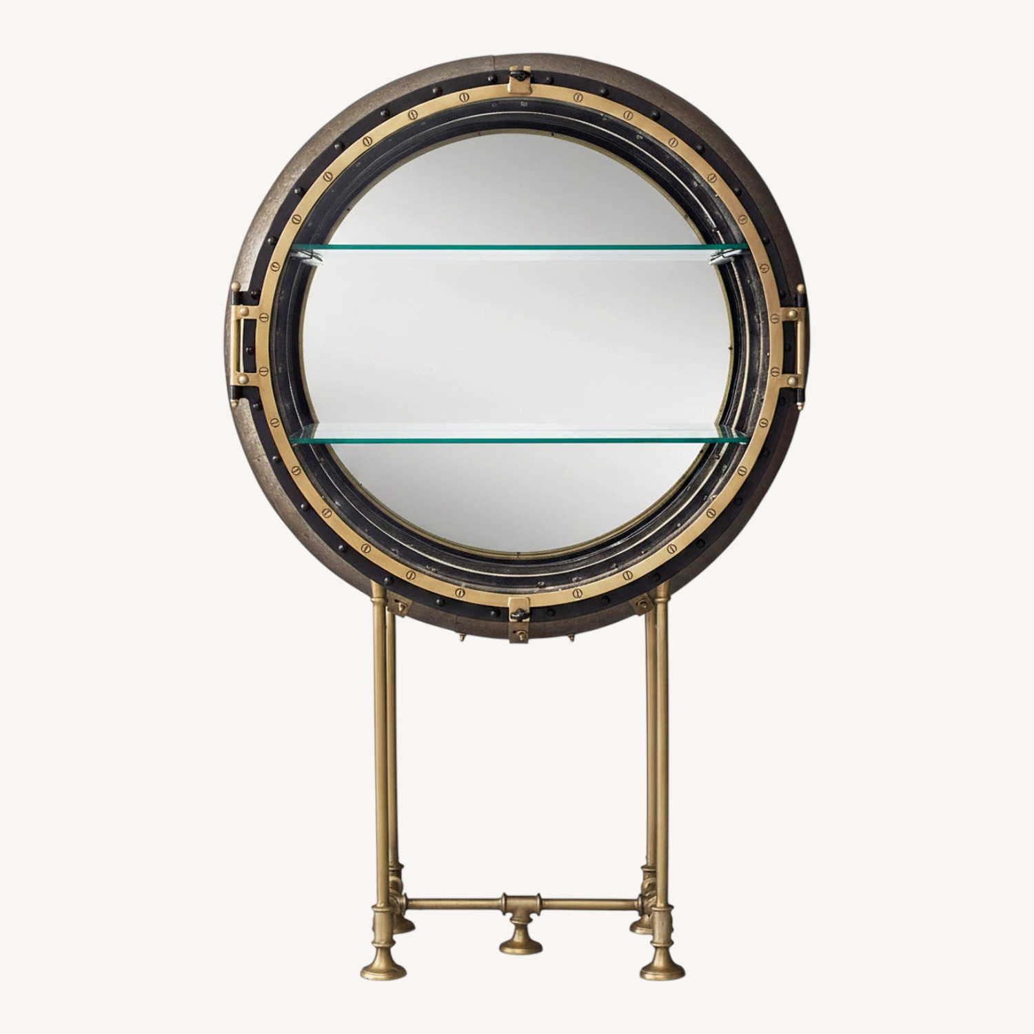 Modeled on a 1920s industrial iron sphere, our Porthole Bar evokes cocktail hour on the high seas. Set atop a pipework base, its dramatic glass door is edged in metal with exposed rivets and features a mirrored interior.