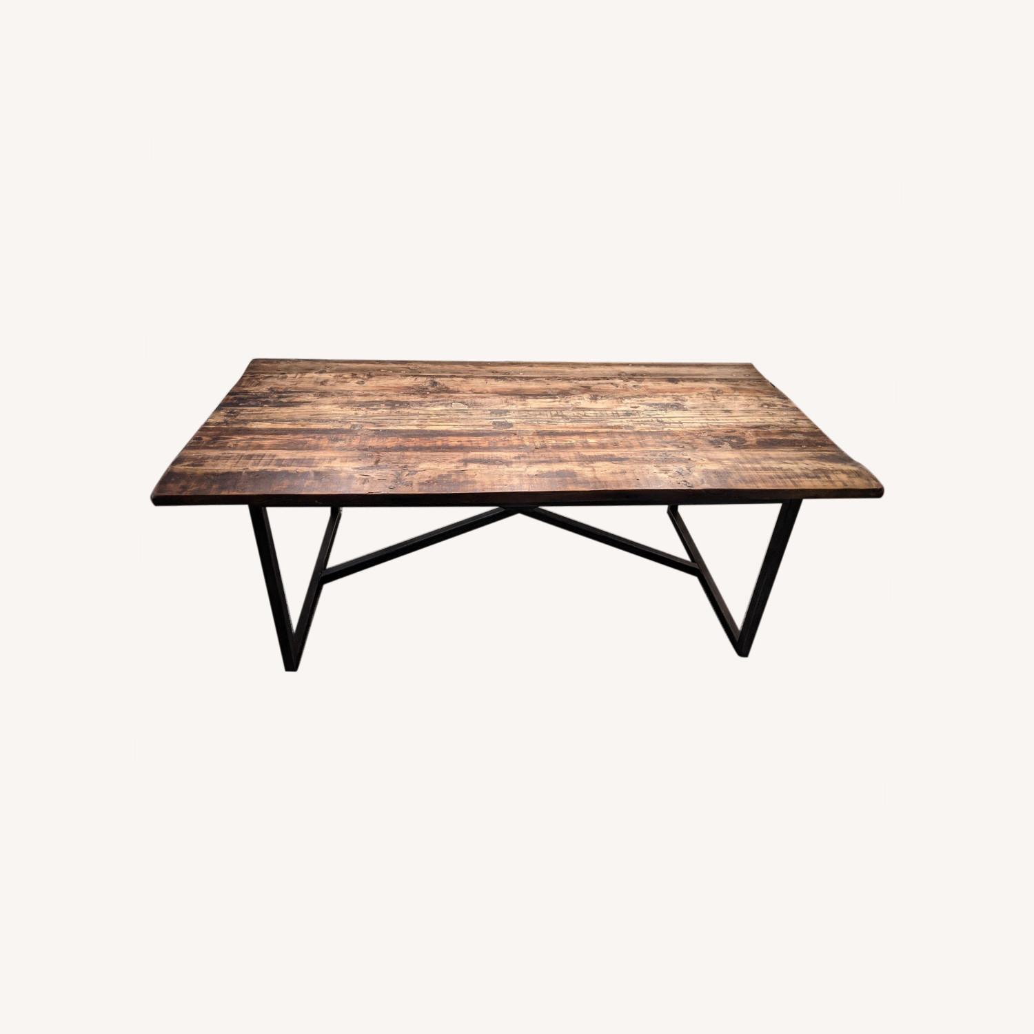 Seller's Notes:This is a beautiful table and we absolutely love it! We are selling it because we're moving overseas and are unable to bring it with us. It's a real statement piece and looks gorgeous, whether you've set the table or left it completely bare. We've priced it to move. "In the hands of skilled woodcrafters, fishing boats that are no longer seaworthy get new life on land as the well-traveled tops of our metal-base tables. The hardwood planks bear dings, dents, nail holes, metal bolts and other vestiges of time and use, making each table unique. DETAILS - • Handcrafted from vintage hardwood planks salvaged from boats • Sanded for evenness and left unfinished • Some original metal bolts are left intact • Set on square-stock iron bases • Given the handmade and hand-finished nature of these items, variations in the wood and metal are to be expected and celebrated. Each item is unique and no two are exactly alike. • By their nature, salvaged wood planks may be somewhat uneven, and may cup or bow slightly over time, further enhancing their rustic one-of-a-kind character • Table seat up to 8 • 84"L x 42"W x 30"H; 187 lbs."
