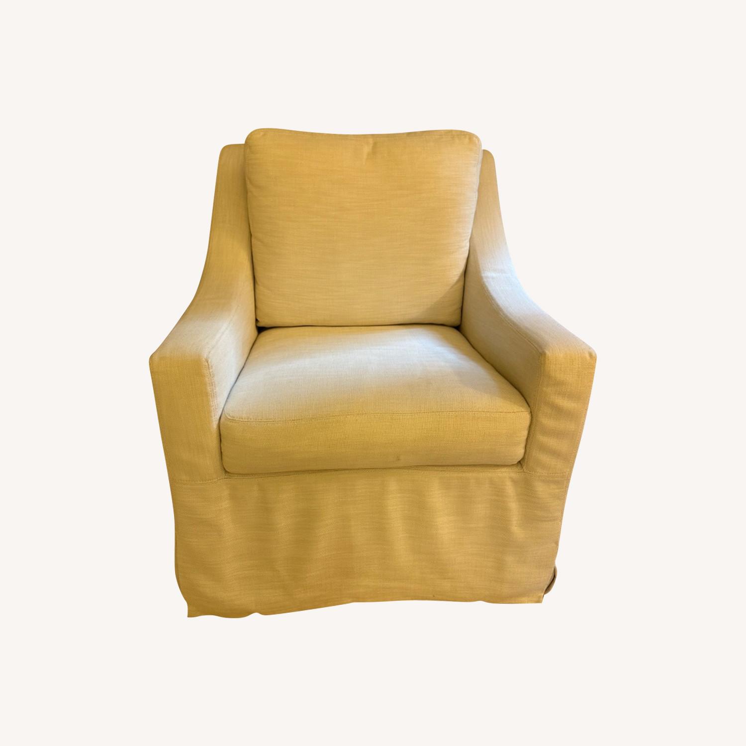 Seller's Notes:An enduring design that complements a range of interiors, this glider features gently sloped arms for support, densely padded cushions for comfort and ample space for bonding. A hardened steel mechanism ensures a full-motion swivel and glide. There are a couple of subtle stains but I’m sure those could be removed with a cleaning. Perennials Performance Textured Linen Weave Fabric