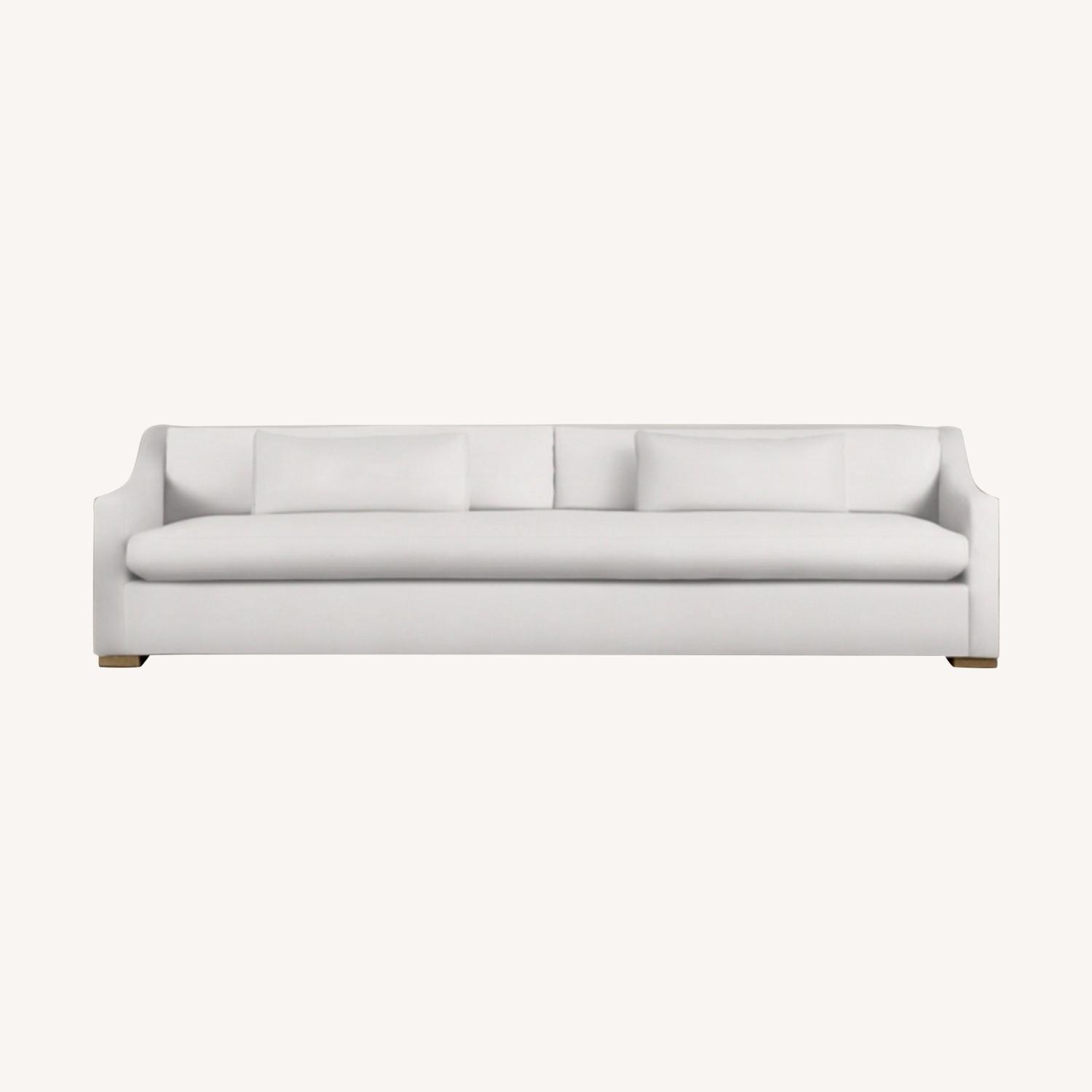 Seller's Notes:Restoration Hardware Belgian Classic Slope Arm Sofa Length: 8 feet Depth: Classic - 38" Fabric: Perennials Performance Classic Linen Weave Color: White Fill: Down-Feather Classic Depth in White Perennials Performance Classic Linen Weave with Down-Feather Fill. A classic interpretation of the European-inspired slope arm sofa. Low to the ground, deep in profile and sleekly streamlined for casual yet sophisticated appeal, it offers luxurious comfort. Has been in use for one year. Has not been cleaned once and still looks great. Some minor spots on one side of seat cushion that likely can be eliminated with a sofa cleaning. Performance fabric is great.