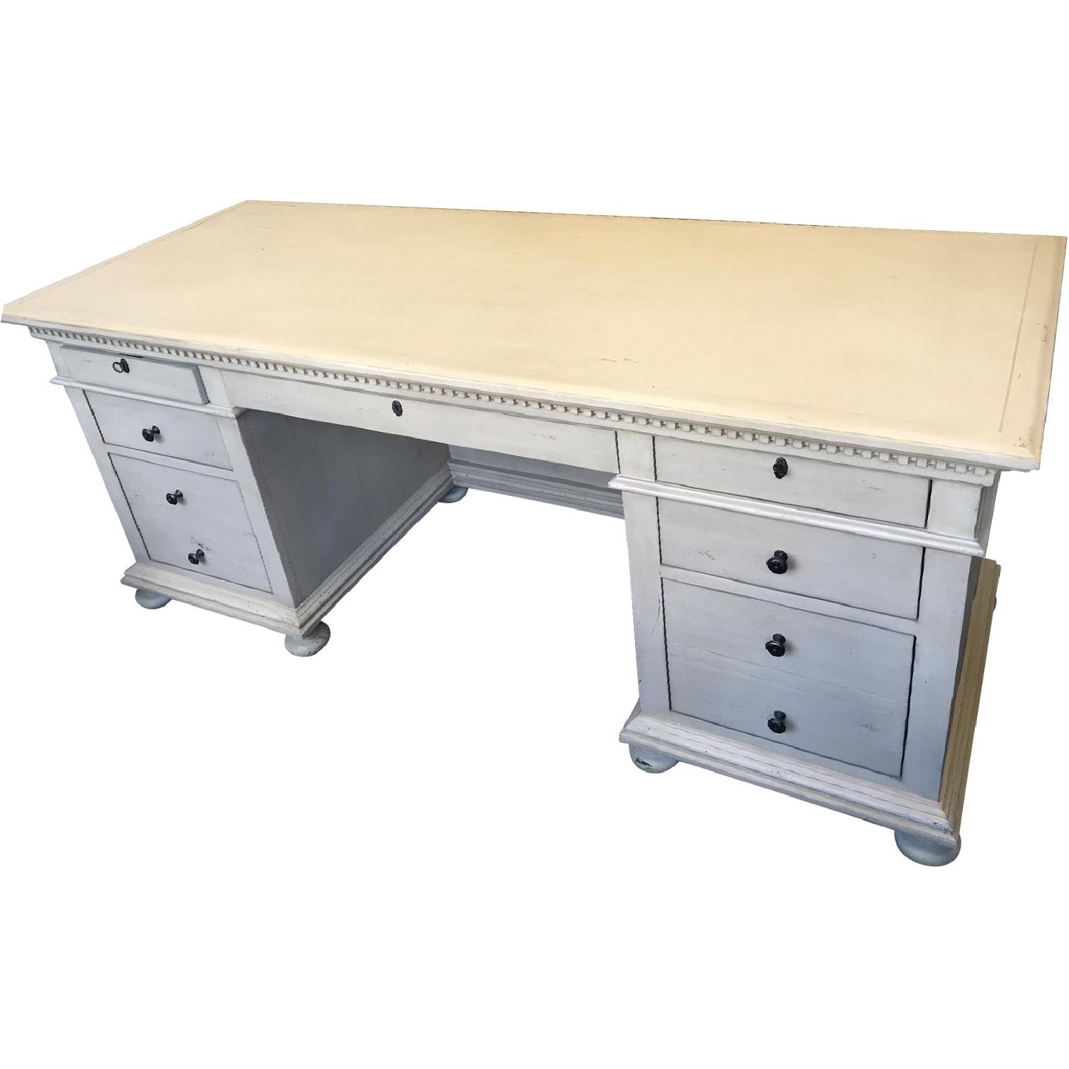 Seller's Notes:Used in a corporate Not-for-profit office environment. We have moved offices and the desk no longer fits the decor and space. The blemishes are minor wear stains from normal desk use (see photo). The desk itself has a rustic antiqued finish with texturizing in the wood for character. These are not blemishes, but how the furniture was intended to look. (Please see second picture for detail) Evoking the architectural classicism of turn-of-the-century design, St. James is grand in both scale and beauty.
