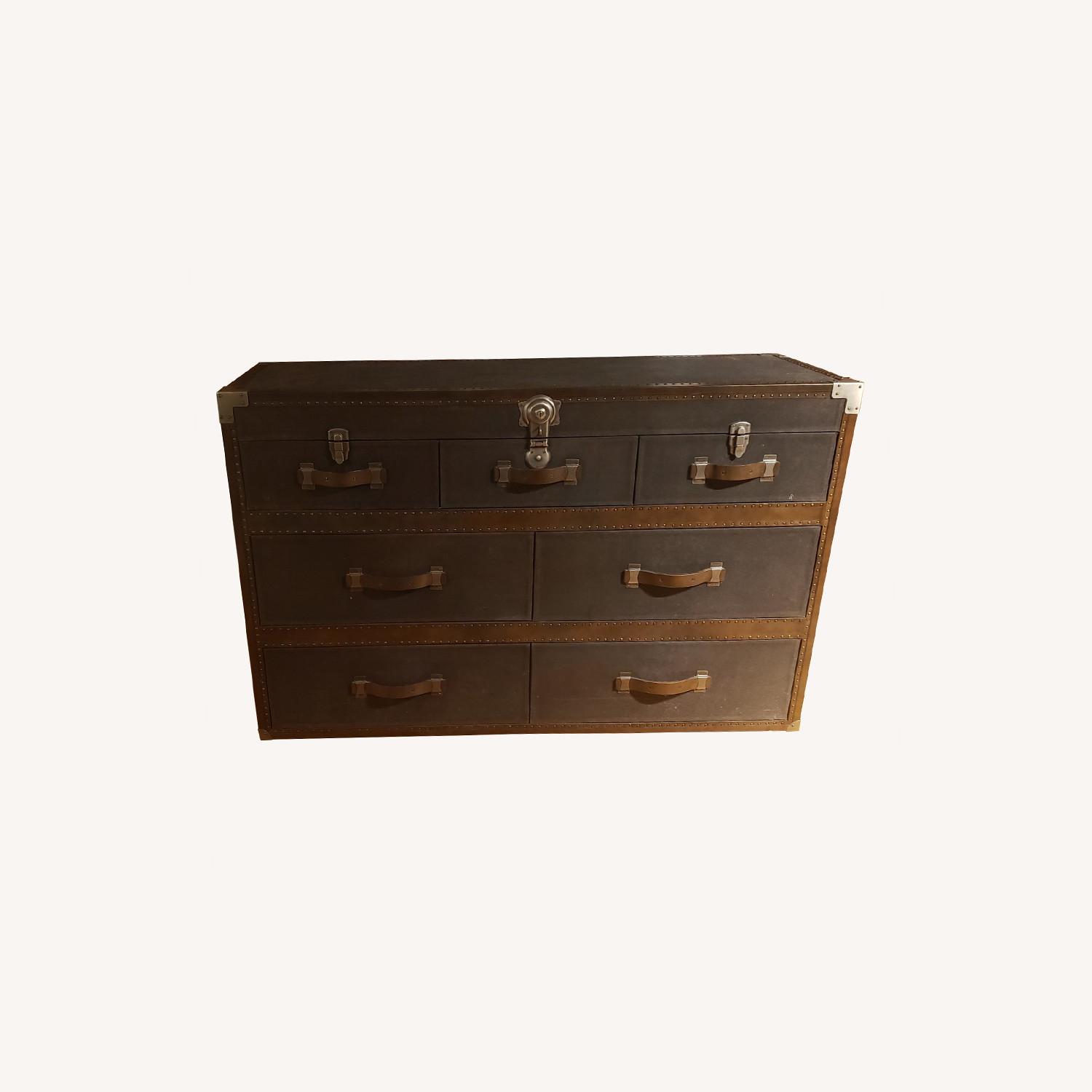 Seller's Notes:Classic leather-bound steamer trunk inspired our functional collection. Featuring a sturdy, canvas-covered frame, each piece is detailed with hand-hammered nailheads, metal corner brackets and leather handles just like the vintage originals.