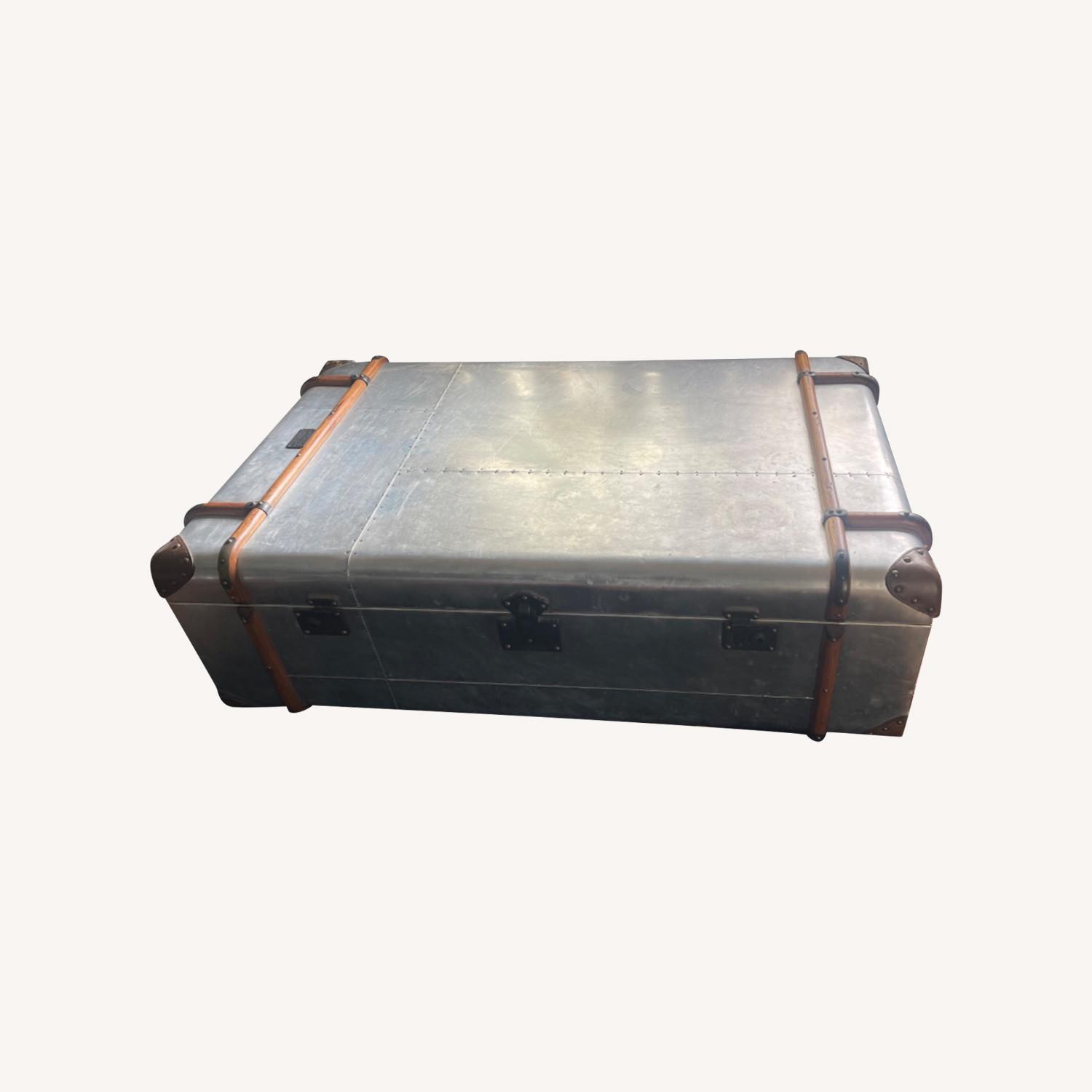 Seller's Notes:Regular wear and tear, but in fantastic condition, just too large for our living room. These Retail for $3000-4000. “Richards’ Trunk Coffee Table by Restoration Hardware. After seemingly circling the globe, a canvas-clad steamer trunk landed at a famed European antiques market. It was battered and worn, but its careful construction and handsome detailing marked it as bespoke luggage, crafted in early 20th-century England for a traveler of discerning taste (a traveler whose name – according to the brass plate mounted above the latch – was Tom Richards). Plucked from potential obscurity, the trunk made its way to the workshop of Timothy Oulton, where it was painstakingly dismantled, every pin removed and measured, every hinge and brace scrutinized. And from that well-made, well-traveled trunk, a collection was born. This polished aluminum version was inspired by the gleaming nose cones and fuselages of mid-20th-century aircraft, clad in a patchwork of polished aluminum panels accented with exposed steel screws. Each piece is constructed in precisely the same manner as the original and aged to look as if it’s seen epic journeys of its own. Wood frames are clad in polished aluminum, accented with steel screws. Aluminum has a matte finish that’s lightly distressed for a vintage look; intentional nicks, dings, small scratches and other imperfections are to be expected and add to the character and uniqueness of each item. Braced with strips of aged solid wood trimmed with antiqued brass. Fitted with decorative leather handles and corner protectors. Equipped with brass luggage latches. Black canvas-lined interior, features 2 hidden canvas-lined drawers that open on either side.”