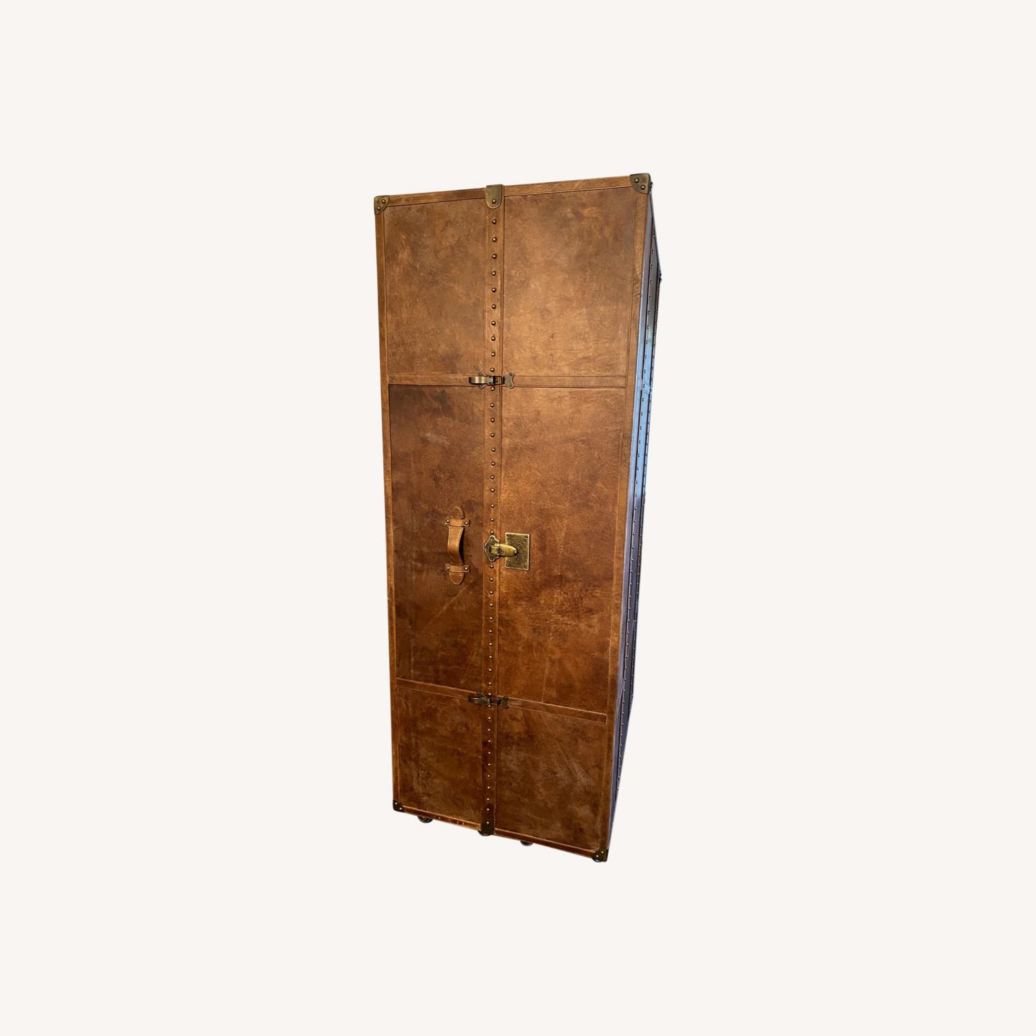 Seller's Notes:This gorgeous portable office trunk is the focal point in any room. This vintage leather trunk office has a pull down desktop with many shelves, drawers and cubby-holes. Truly unique, easy to move without having to unload compartments. The interior is light tan, lighting in pictures does vary. There is fading in some of the compartments as you see in the pictures. Stands on wheels for mobility and closes for storage and privacy.