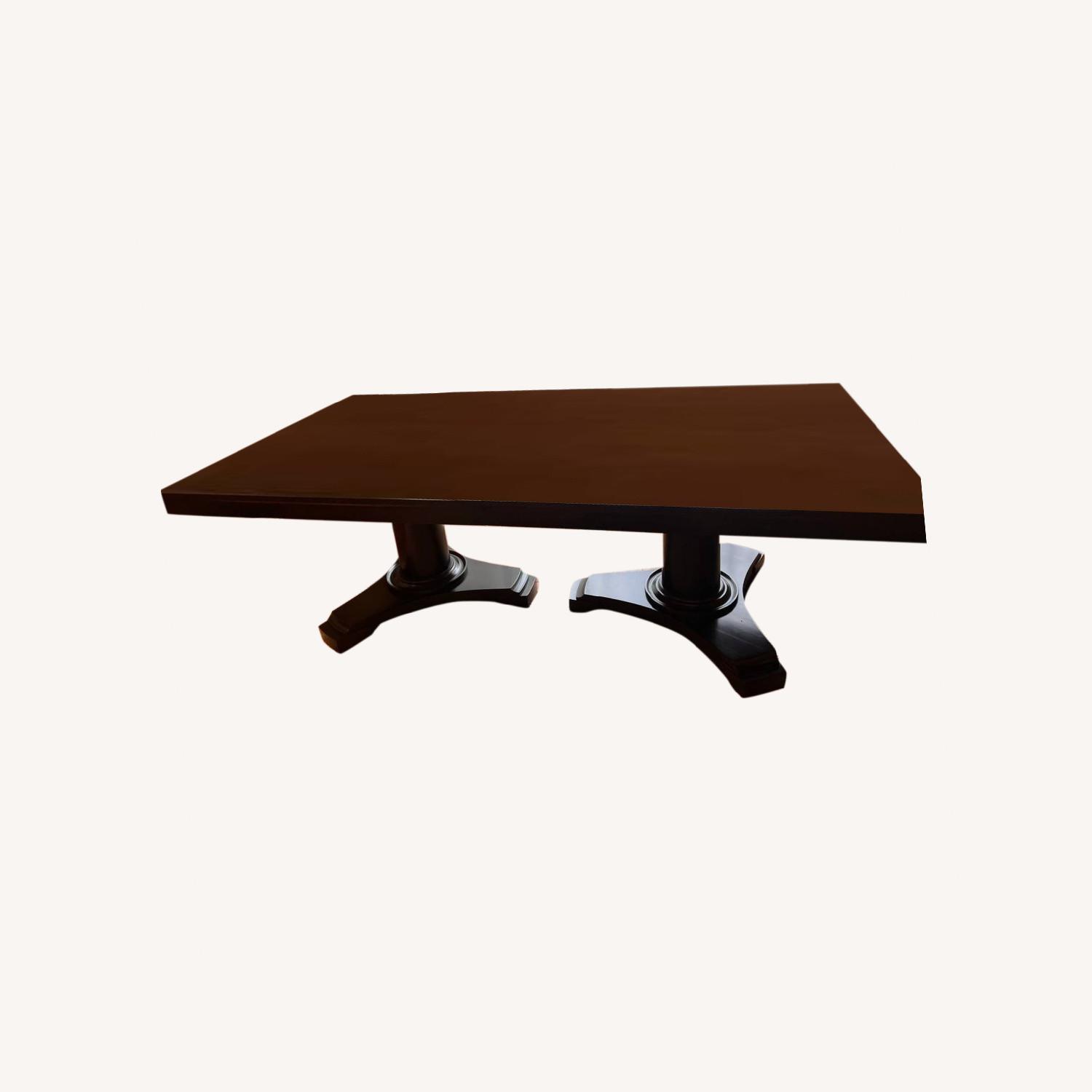Seller's Notes:Restoration Hardware dark coffee colored double pedestal table- good condition.