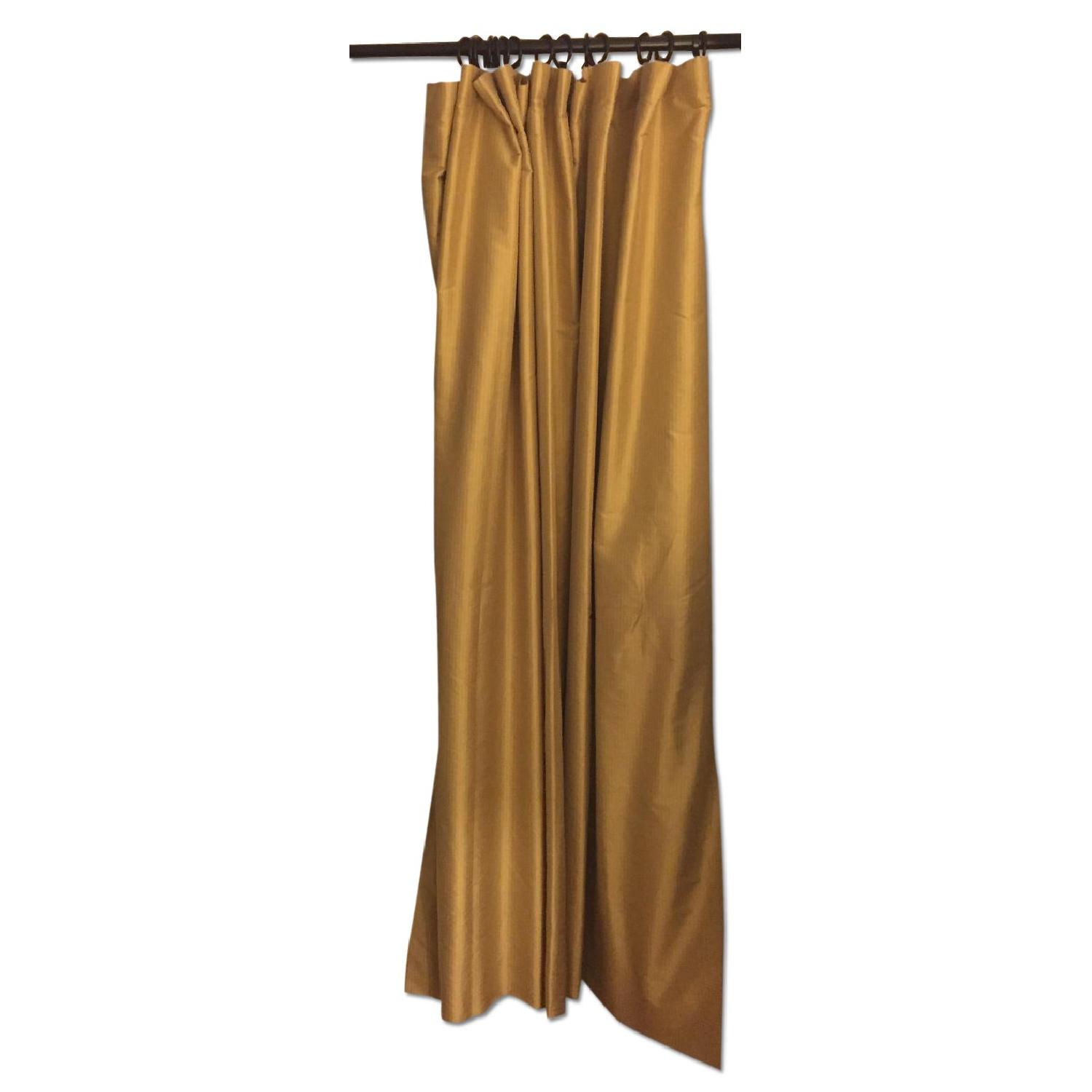 Seller's Notes:RH silk curtains for a great deal! Changing the color scheme in my apt and have to get rid of them. Price includes 2 panels of rod pocket silk drapery by Restoration Hardware. Tonal stripes in goldenrod color (see link below). Hardware and drapery hooks are not included and price includes panels only. Curtains are in good shape except for a tear on the left side of right panel (see picture of tear included in post). It could be easily seen sewn or you could also swap the panels so the tear is on the right panel next to a wall and now one will notice. https://www.restorationhardware.com/catalog/product/product.jsp?productId=prod2880216&categoryId=&src=rel