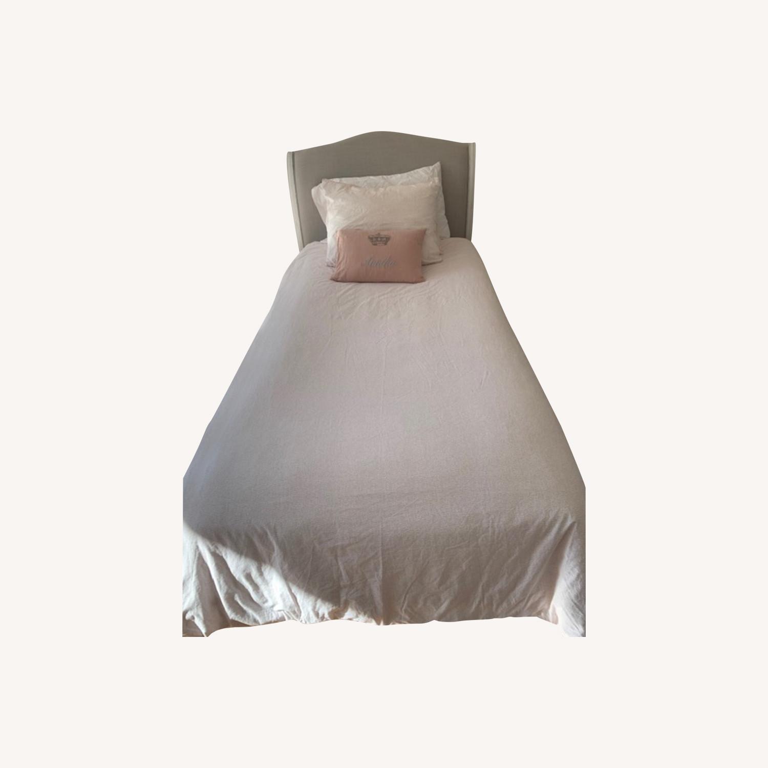 Seller's Notes:Twin bed frame in EXCELLENT condition. Great quality. Does not need box spring. Light grey fabric headboard, white wooden frame. No longer needed. Two available.