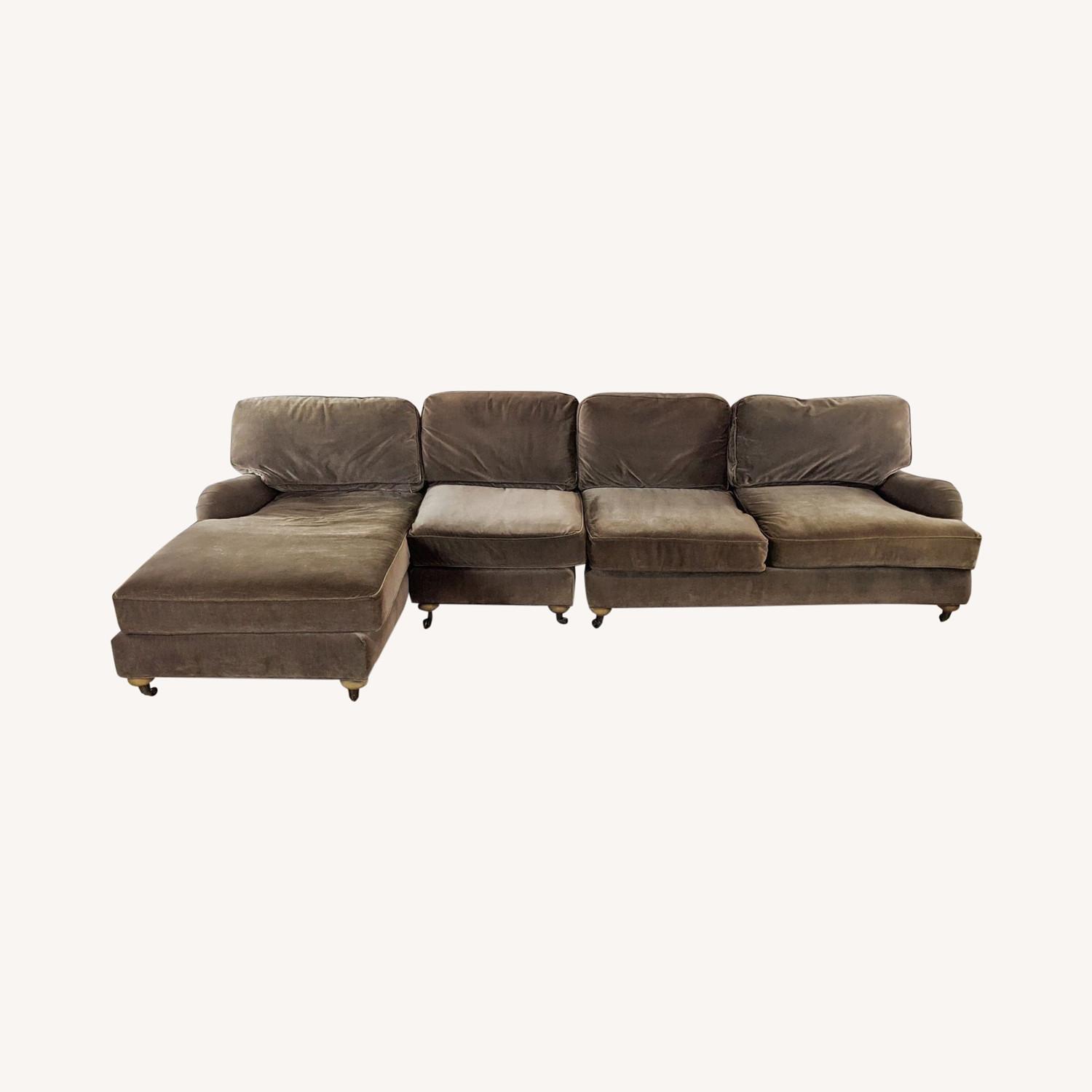Seller's Notes:Three Piece, Brown Velvet Sectional With Chaise Offers Traditional Styling With Modern Twist- Featuring Ruched Arms And Legs On Casters. Brand: Restoration Hardware. Dimensions: 123x61x28.