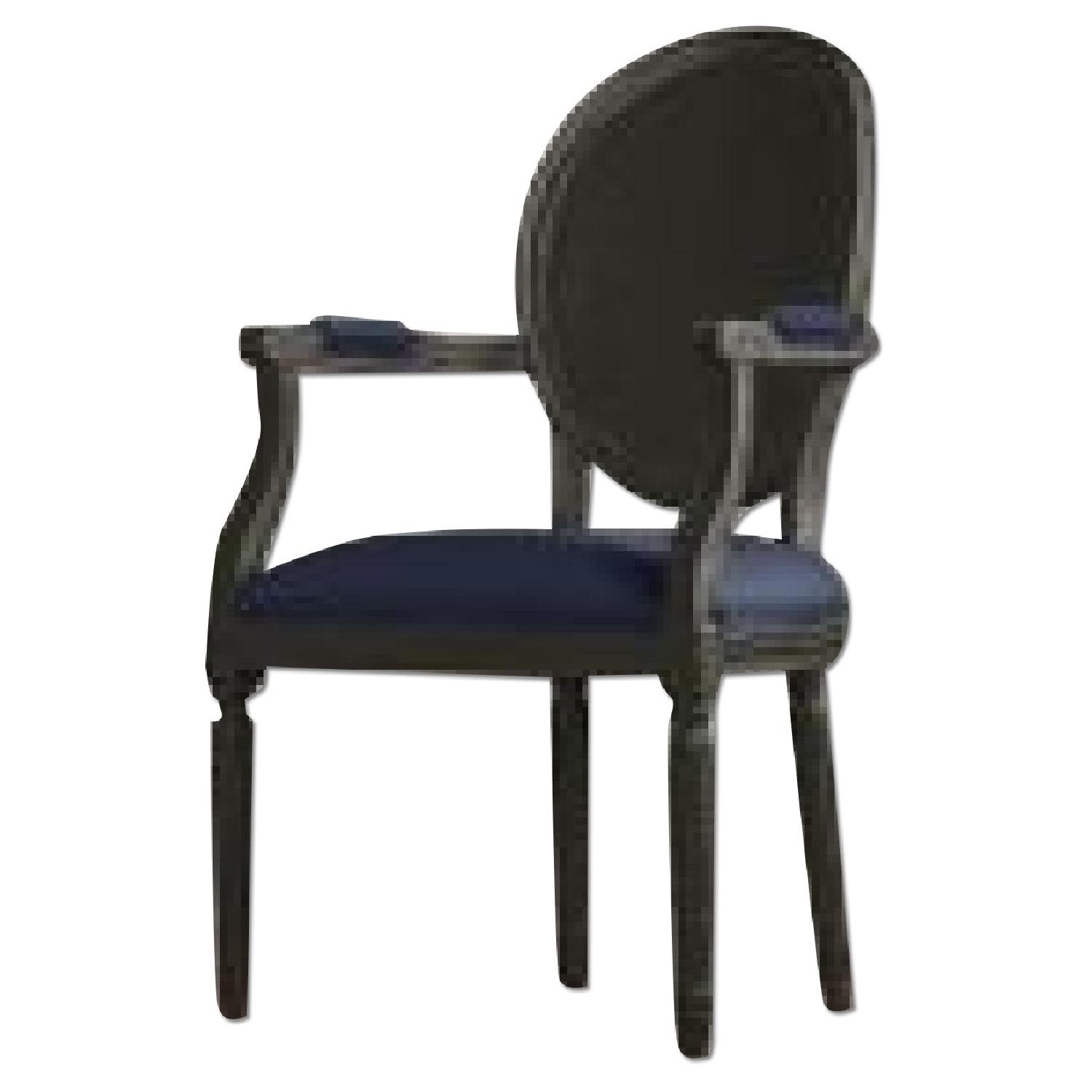 Seller's Notes:These Armchairs have the perfect rustic and chic mix with rich velvet upholstery and a cane back. They make great accent chairs, reading desk chairs or head chairs for a dining table like seen in the pictures. We bought them a few months ago and unfortunately have to part with them as we are moving. There is a minor water stain only on one of the chairs, however it is not very visible. Specs: Wood Finish - Black Oak Drifted, Fabric - Vintage Velvet, Fabric Color - Indigo. Originally bought these chairs for $1140 (including tax) + $200 delivery.