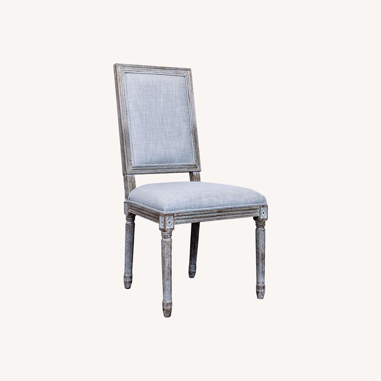 Seller's Notes:Neoclassic design defined by linear form and tapering fluted columnar legs, the chair is constructed of hand-carved solid oak with a whitewash finish.. Brand: Restoration Hardware. Material: wood,fabric. Seat heigt: 18.25. Retail price: $799. Gently used - any blemishes or damage will be included in the photos. #SKU: 1065221. Tags: liquidation,wood,oak,fabric