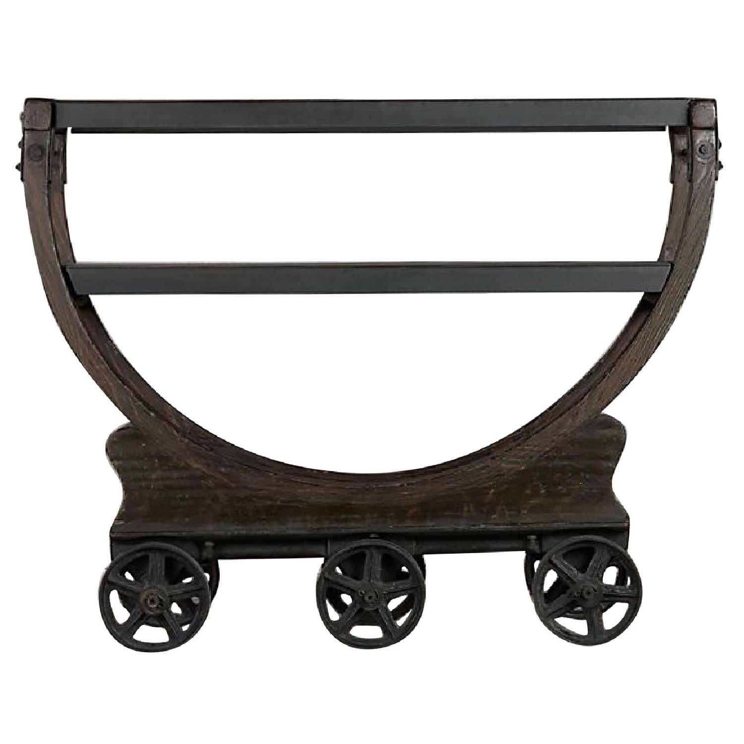 Seller's Notes:A wood-and-iron cart that transported spools of wallpaper in an early 20th-century American factory was the inspiration for our rolling bar. We've reproduced the original faithfully, down to the scuffed, edge-worn wood and the mismatched cast iron wheels. Built of solid aged pine, with foundry-cast iron wheels and chassis Shelves and handles are made of steel with an aged, blackened finish Expert finishing and distressing reproduces the character of the century-old factory cart on which this piece was based This item is artisan crafted with meticulous care. Given its handmade and hand-finished nature, variations in the wood or metal work are to be expected and celebrated.