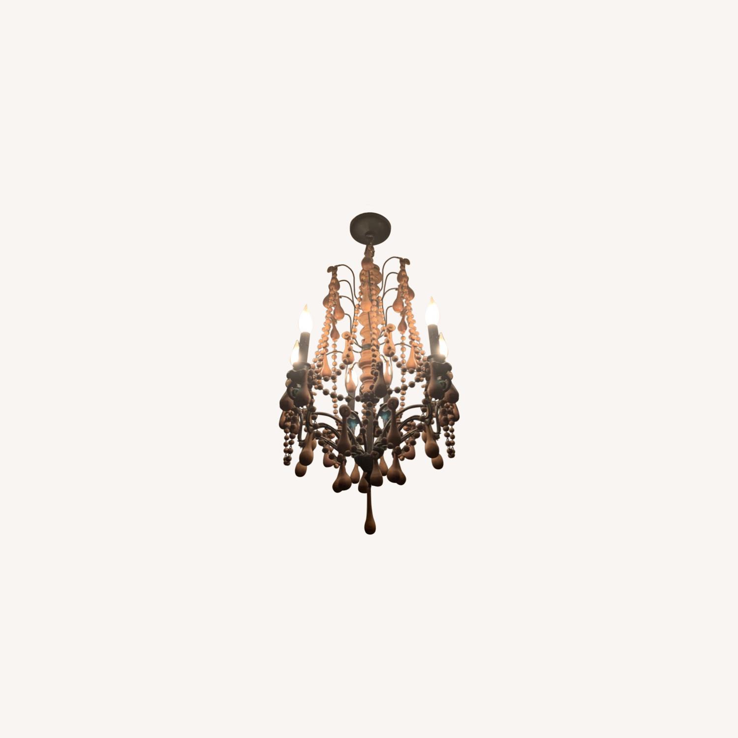 Seller's Notes:Beautiful wood chandelier in excellent condition from Restoration Hardware! Heading and pendant detail, 6 lights included. In excellent condition.
