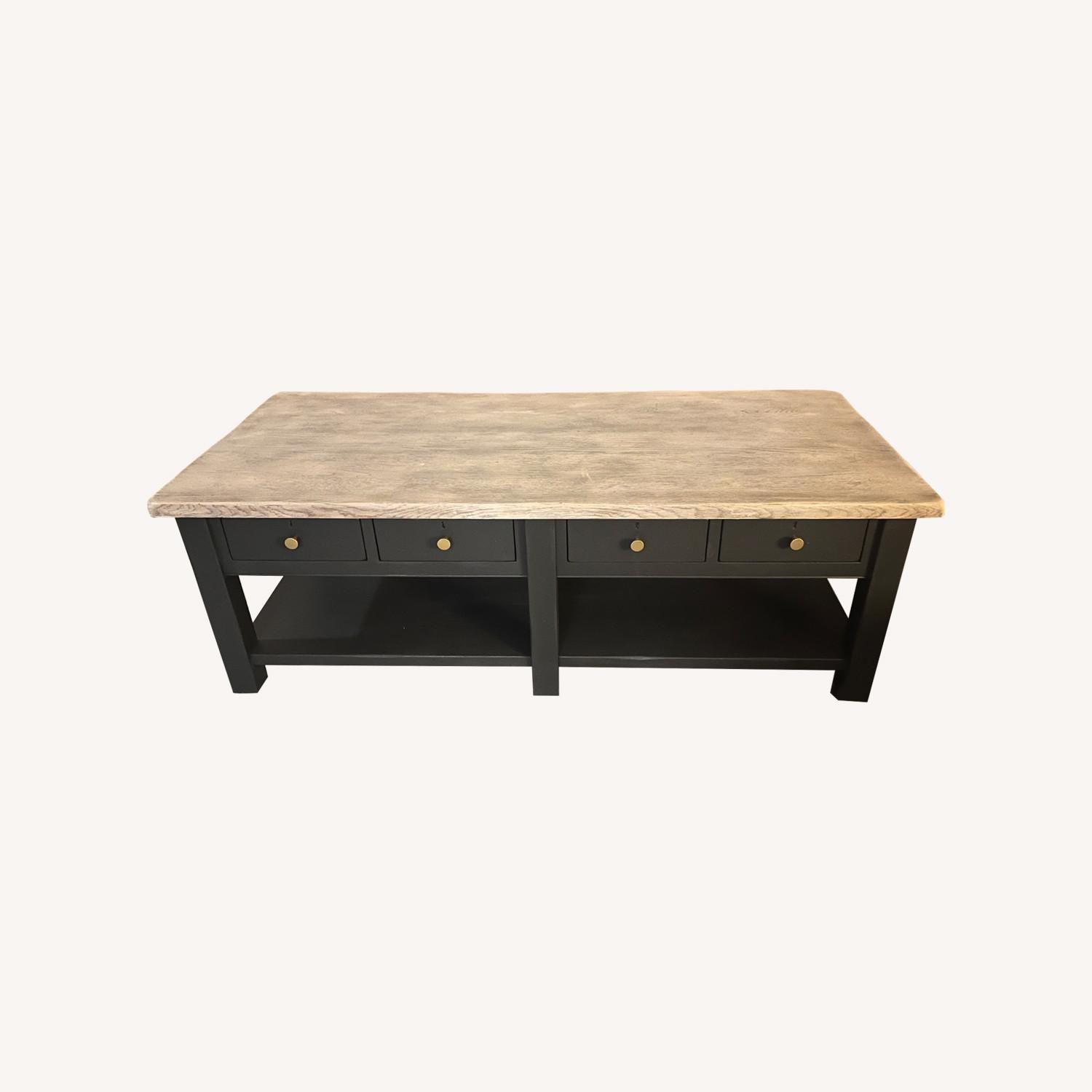 Seller's Notes:This vintage restored a coffee table is about circa 1990s. It's unique as the drawers slide in and out of both sides of the coffee table. it Its 56 long. 24 inches wide, 19 feet inches high The variations in the table top is the natural wood grain. Real oak coffee tables are hard to find, especially at this price. Similar coffee tables are currently going anywhere from $1000-$5000. Re-finished in the color chimney smoke, table top was sealed with a clear wax (Magnolia home by Joanna Gained). Please note any deviations in the table are the natural wood grain. I think the gold knobs complement the table however I do have silver if you prefer. It is extremely heavy.
