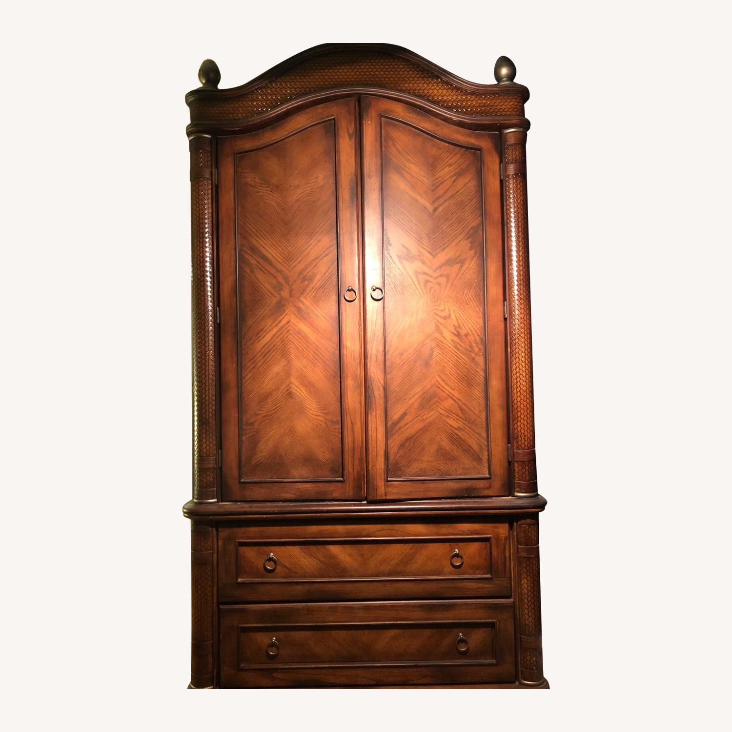 Seller's Notes:Beautiful wood, leather and metal armoire / wardrobe / dresser. Two drawers + ample storage space for either shelves or hanging clothes. The wardrobe is pre-drilled for a hanging bar. The top half of wardrobe will unscrew from bottom drawers for easy moving.