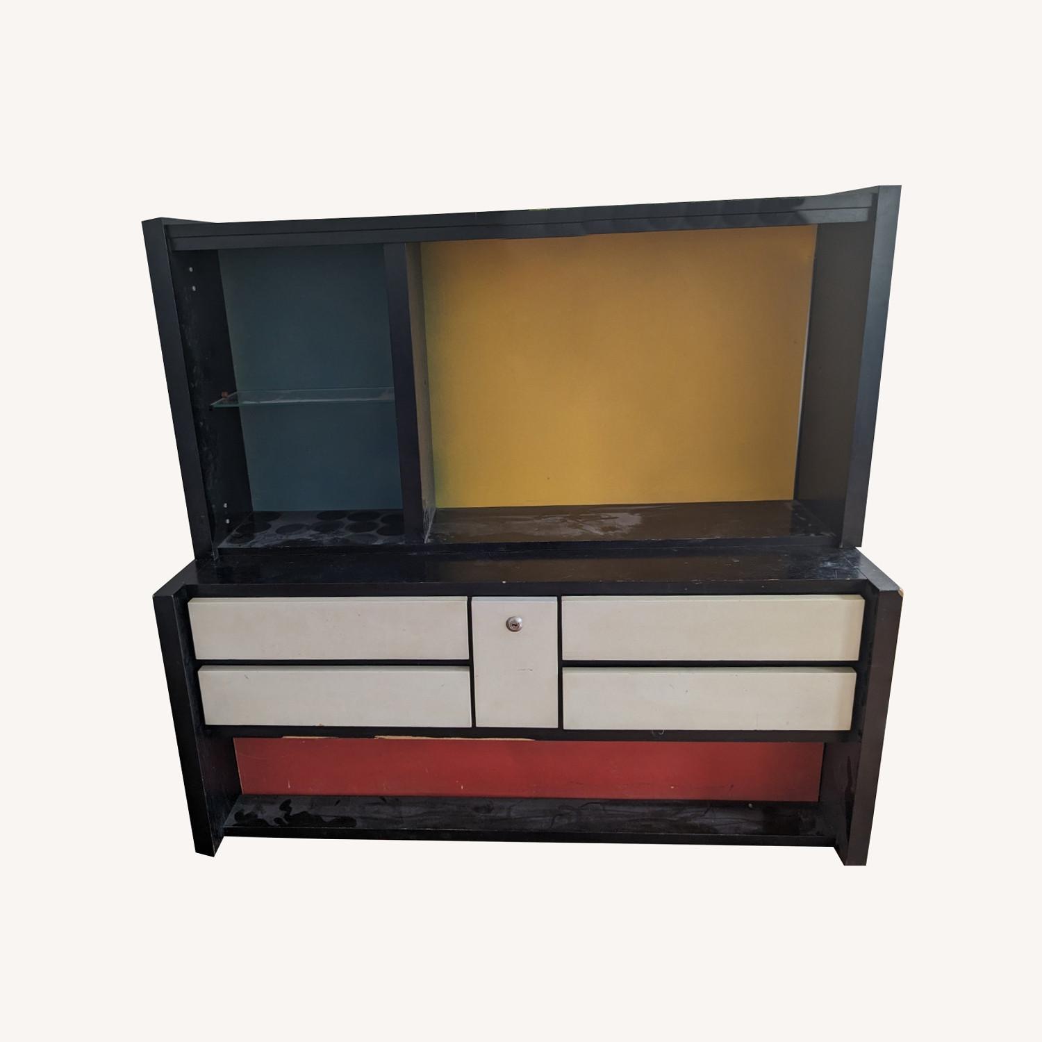 Seller's Notes:Retro bookcase with black, red, green, and yellow color blocking. Bottom component has multiple drawers. I've used this for a few years and love it, but the color palette doesn't work with my new home. Some paint has scratched off, but could be easily fixed with a coat of black paint.