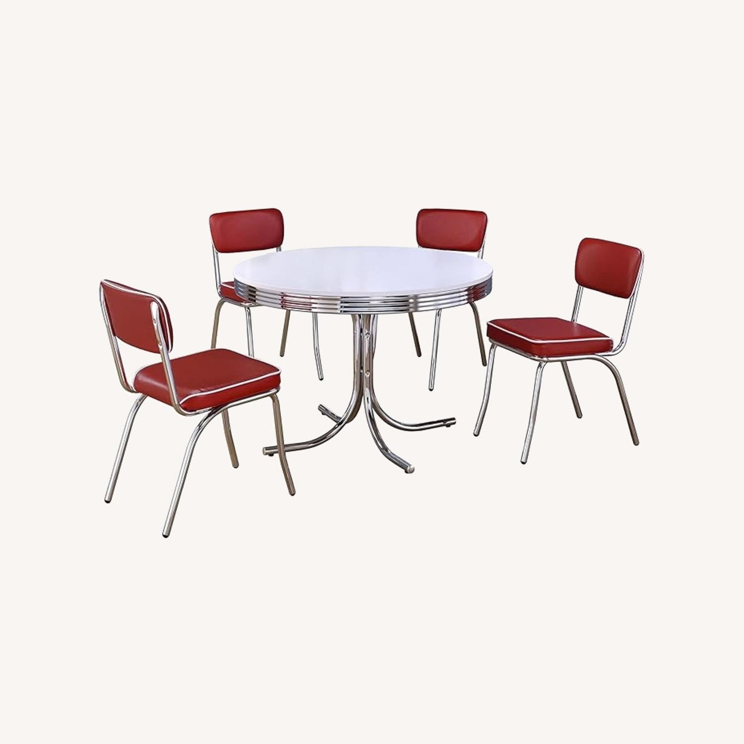 [Retro Charm Meets Modern Comfort] The 5-piece dining set features a 42-inch dining table with a chrome-rimmed top, blending vintage diner aesthetics with modern durability. Perfect for your home kitchen, it provides a stylish and functional space for meals, coffee chats, and family gatherings.