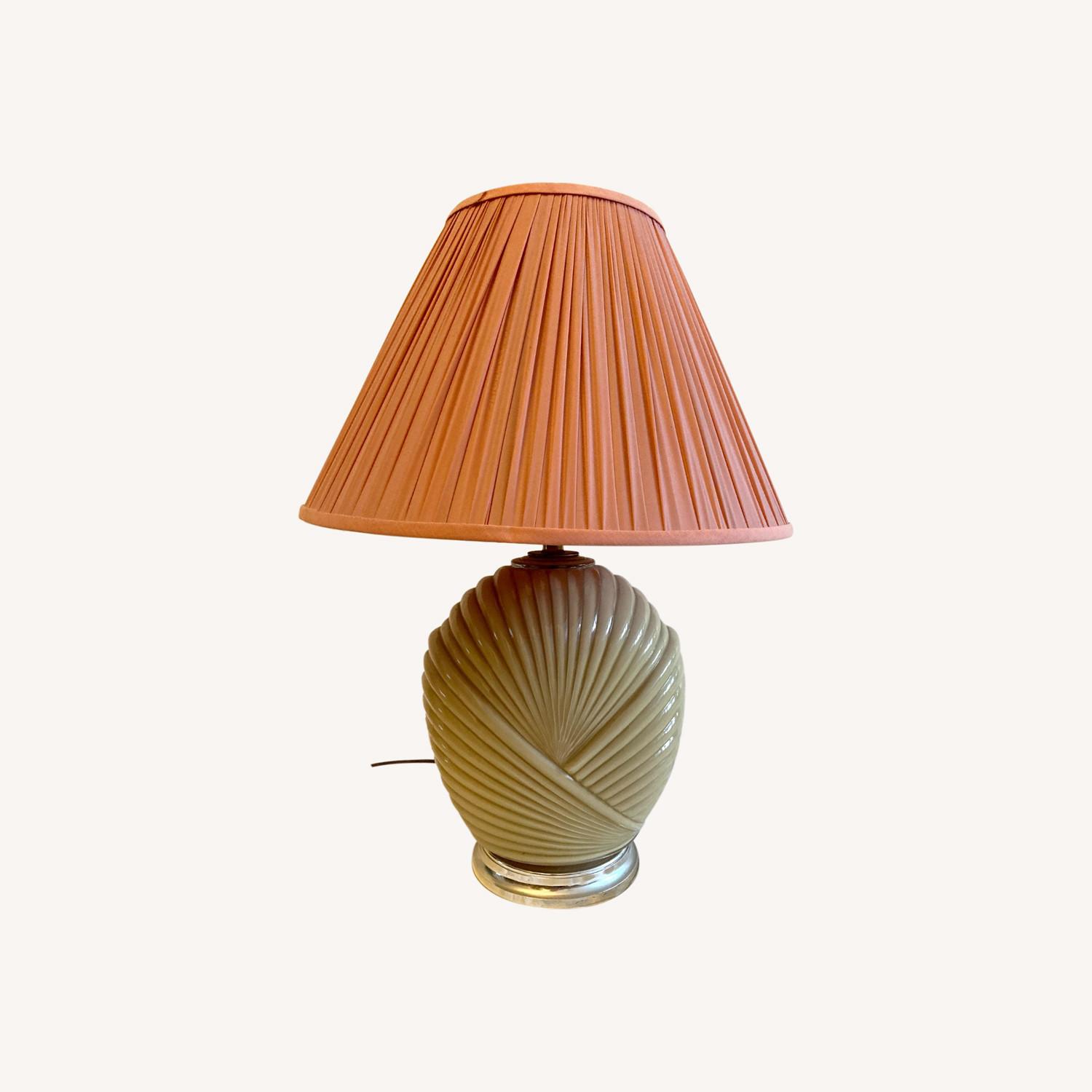 Seller's Notes:Retro table lamp with art deco motif. Glass beige base. Pleated fabric pink lampshade. With shade, height measures 26". Shade widest point is 19.25 wide. From a pet-free, smoke-free environment.